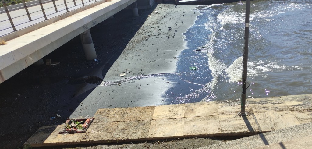 #BajoelManzanillo nos describe el panorama que detecta este 10 de julio de 2021 (y que continúa el 10 de septiembre de 2022) en la desembocadura de la Rambla junto al Cable Inglés, corazón de Almería: el riachuelo fecal de siempre, ya es un río; el géiser, un amasijo de hierros; y, la Ballena de Gabriel, se nos cae a trozos. ¡Qué desastre!