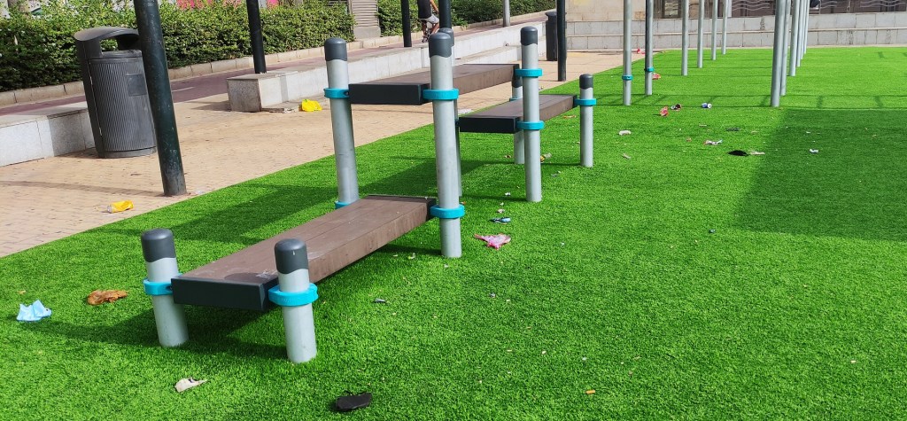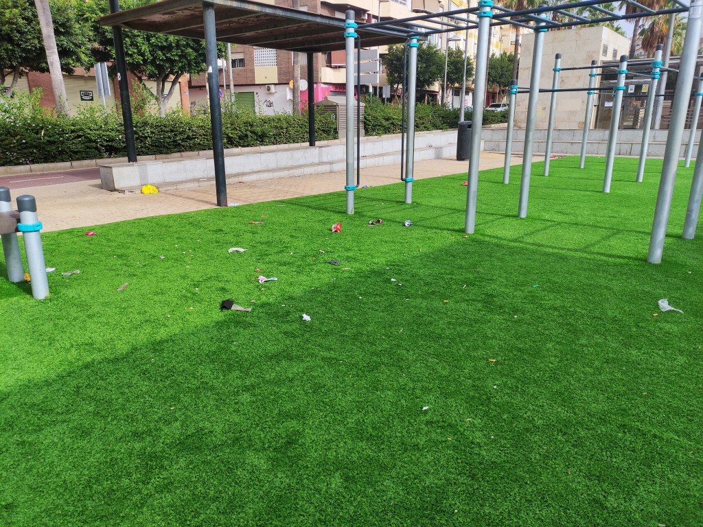 Un mes después, el 16 de agosto de 2021, las cosas en las dos ramblas, de Belén y de Amatisteros, siguen igual o peor. Si bien se ha puesto en marcha, con cierto decoro, algún estanque, otros siguen sin funcionar y secos, la suciedad en general continua acumulándose, y los destrozos se acentúan o aparecen nuevos despropósitos: los chorros para refrescar al personal que camina por la zona de la intersección con calle Paco Aquino están secos, el recién estrenado e impecable parque de calistenia es usado como botellómetro o punto de reuniones juveniles de noche, etc. Las imágenes nos dan cuenta de todo ello: