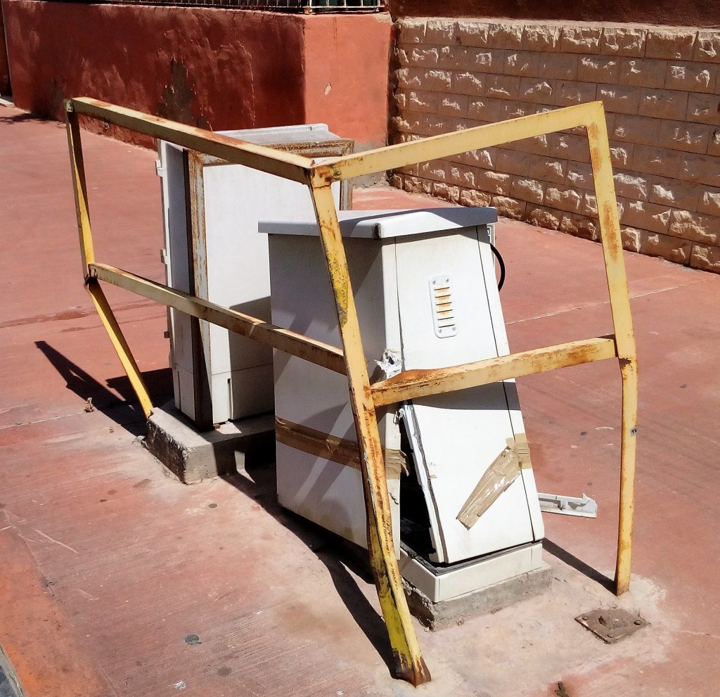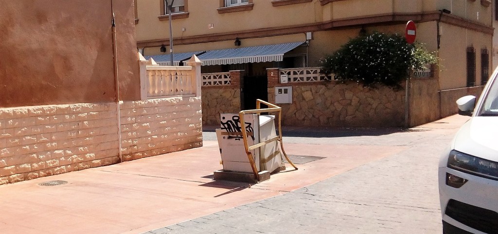 En mitad de la acera, en plena calle Colombine (une la carretera de Sierra Alhamilla con la calle Jaén), esquina con Amanecer, en el barrio de Ciudad Jardín nos encontramos con estos dos registros destartalados que muestran las imágenes, rodeados de un auténtico armazón de hierros retorcidos que protegen el par de cajas de cables, desconocemos si de alguna compañía de servicios de telefonía o internet, o de electricidad o de cualquier otra prestación comunitaria. El hecho que es que ya, de por sí, esa estructura metálica en mitad de la acera representa un auténtico peligro para peatones y para conductores.
