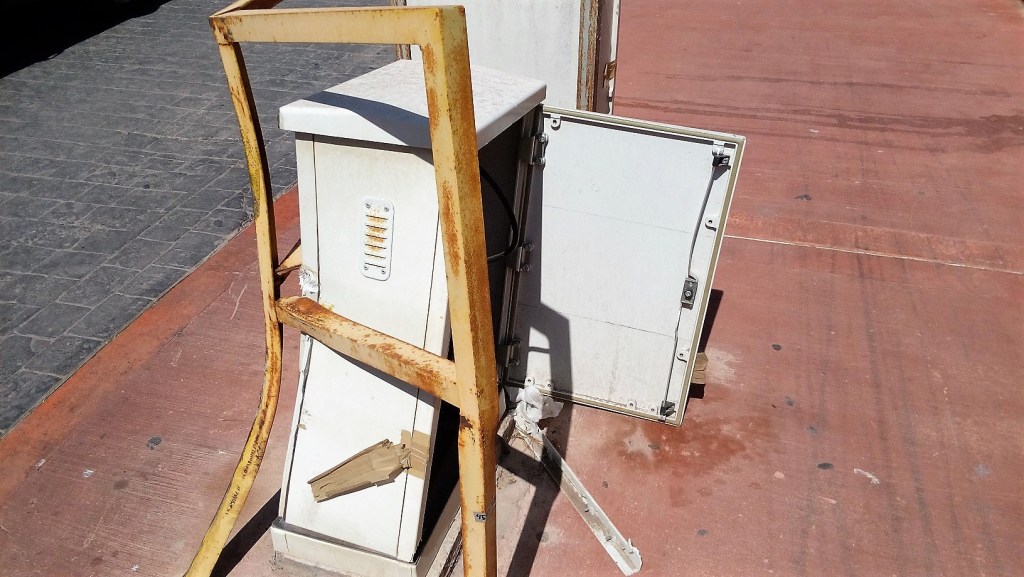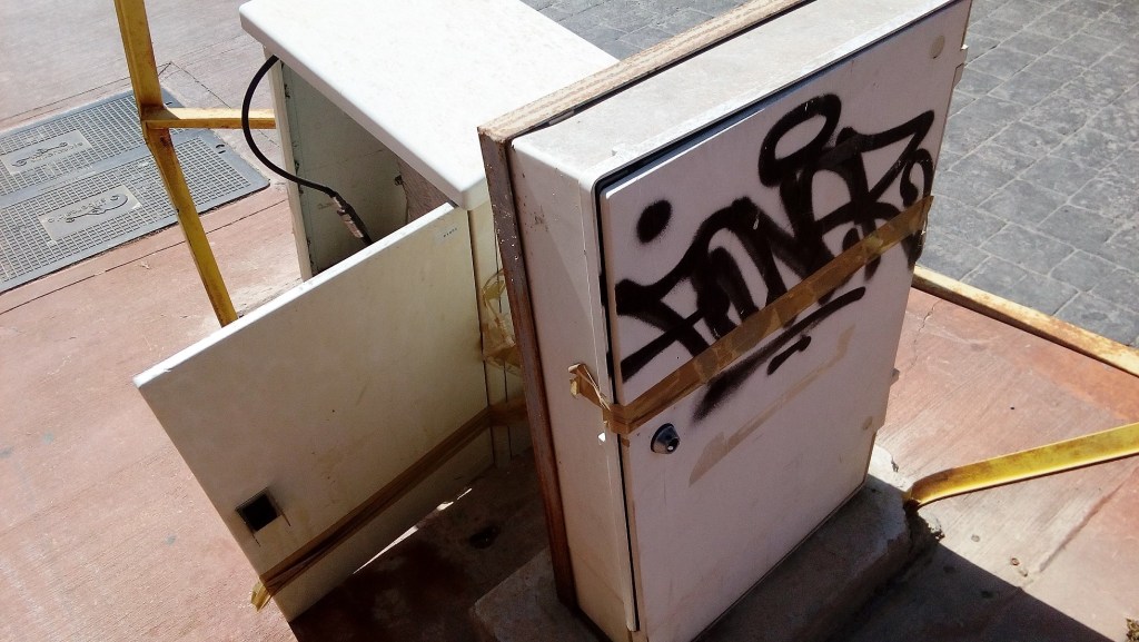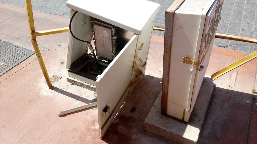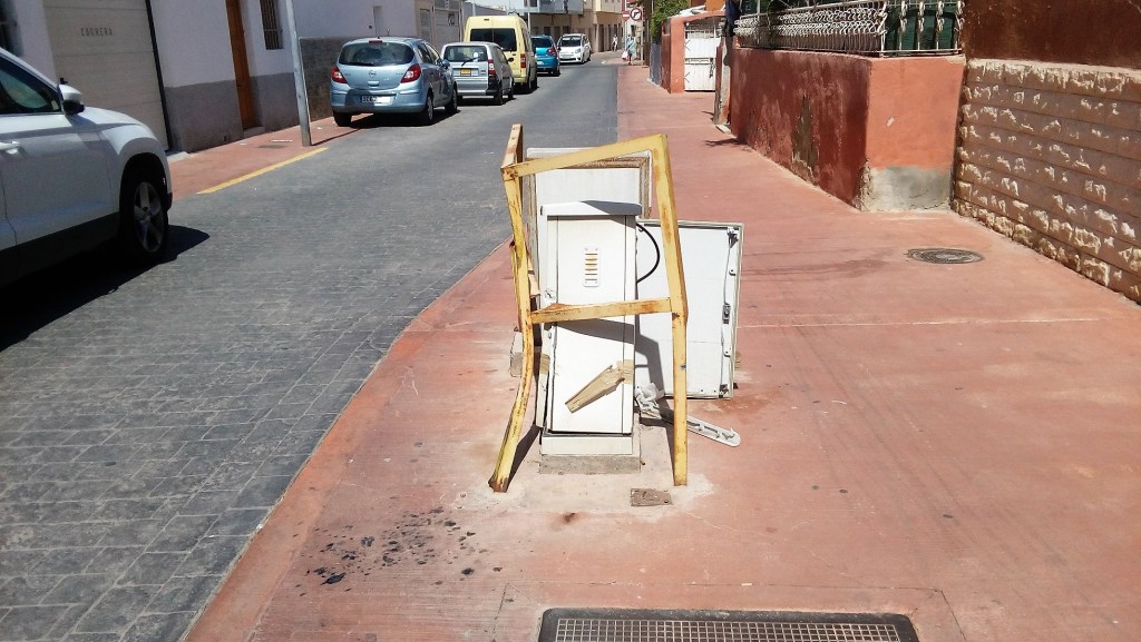 Pero la cosa ha empeorado desde que hace ya bastante tiempo algún vehículo se empotró en la armadura de hierro protectora y provocó que las dos cajas que contienen cables se abrieran y estén a la intemperie. Intentaron remediarlo con precinto adhesivo, que lógicamente con las inclemencias del tiempo y las manos de algún desaprensivo, no sirvió para nada. En pleno siglo XXI, que una chapuza de este tipo permanezca en la vía pública, es un auténtico riesgo para cuantos transitan por la zona. Esos registros deberían estar adosados a cualquier edificio con las debidas medidas de seguridad o bien de forma subterránea, para evitar males mayores, como los ocurridos y los que puedan venir.