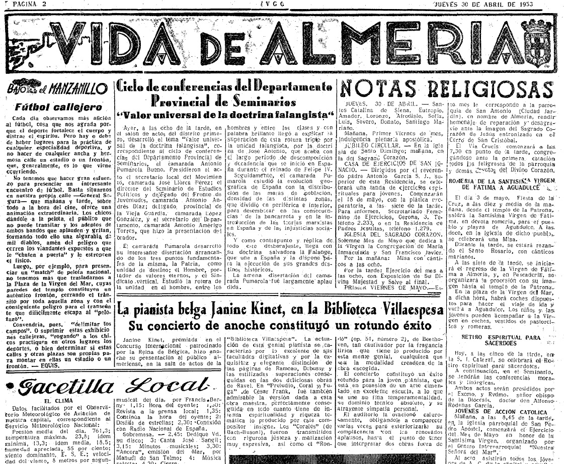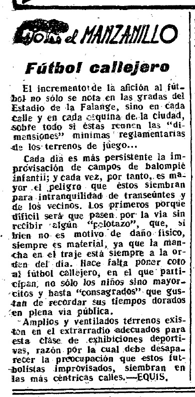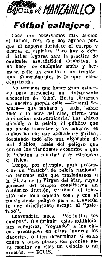 No tenemos que hacer gran esfuerzo para presenciar un interesante encuentro de fútbol. Basta situarnos en nuestra propia calle -General Segura- que mañana y tarde, sobre todo a la hora del cine, ofrece una animación extraordinaria. Los chicos dándole a la pelota, el público que no puede transitar y los adeptos de ambos bandos que aplauden y gritan, formando todo ello una algarabía de mil diablos, amén del peligro que corren los viandantes expuestos a que le «chuten a puerta» y le estropeen el físico.