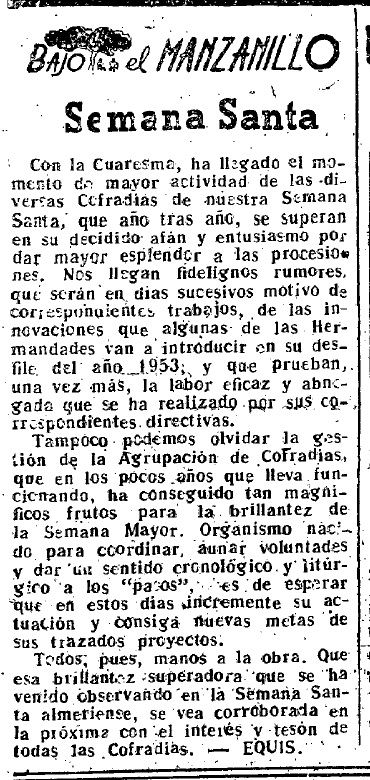 Con la Cuaresma, ha llegado el momento de mayor actividad de las diversas Cofradías de nuestra Semana Santa, que año tras año, se superan en su decidido afán y entusiasmo por dar mayor esplendor a las procesiones. Nos llegan fidedignos rumores, que serán en días sucesivos motivo de correspondientes trabajos, de las innovaciones que algunas de las Hermandades van a introducir en su desfile del año 1953, y que prueban, una vez más, la labor eficaz y abnegada que se ha realizado por sus correspondientes directivas.