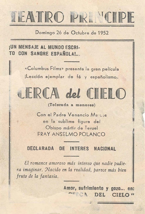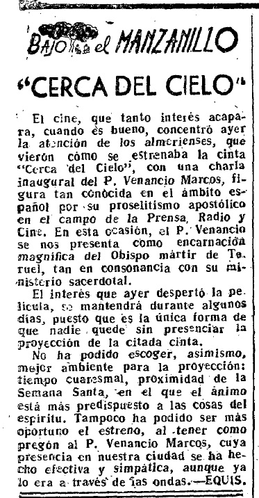 El cine, que tanto interés acapara, cuando es bueno, concentró ayer la atención de los almerienses, que vieron cómo se estrenaba la cinta «Cerca del cielo» (cine Salón Hesperia), con una charla inaugural del P. Venancio Marcos, figura tan conocida en el ámbito español por su proselitismo apostólico en el campo de la Prensa, Radio y Cine. En esta ocasión, el P. Venancio se nos presenta como encarnación magnífica del Obispo mártir de Teruel, tan en consonancia con su ministerio sacerdotal.