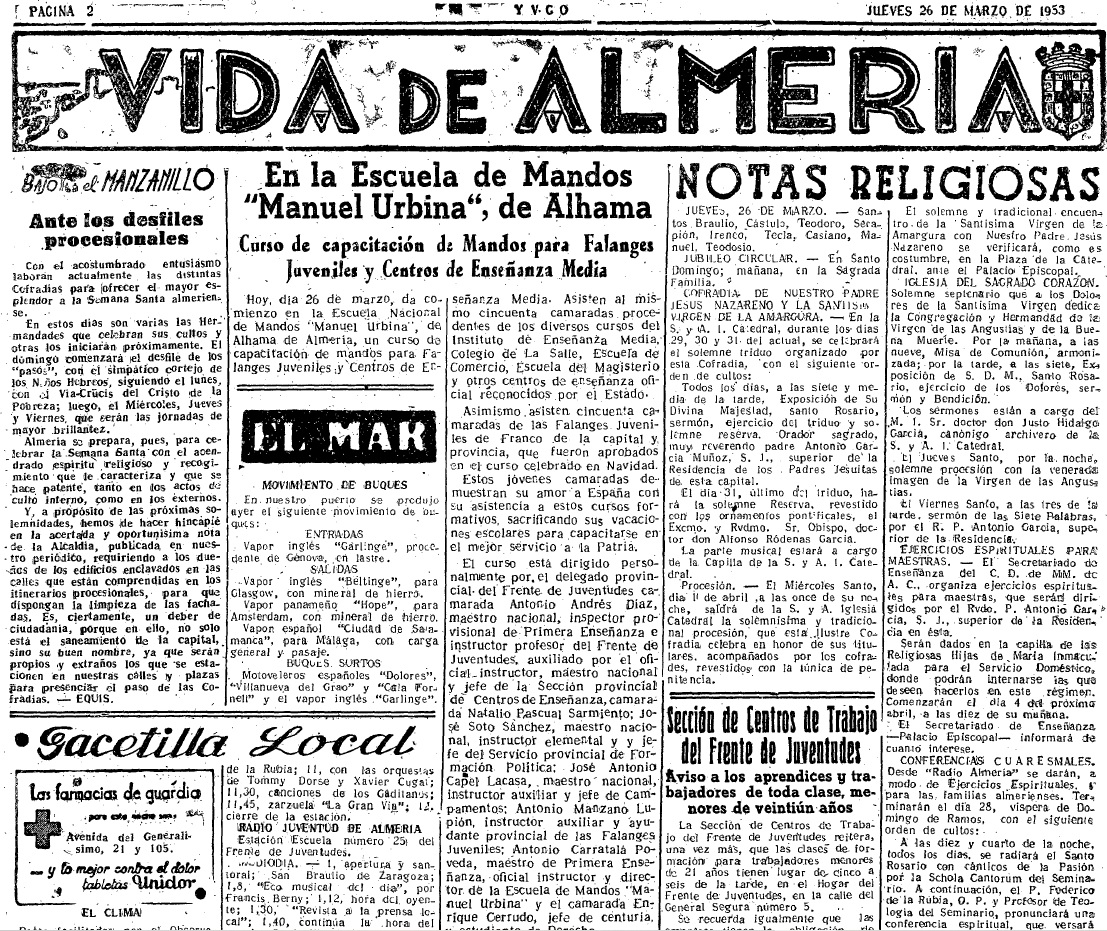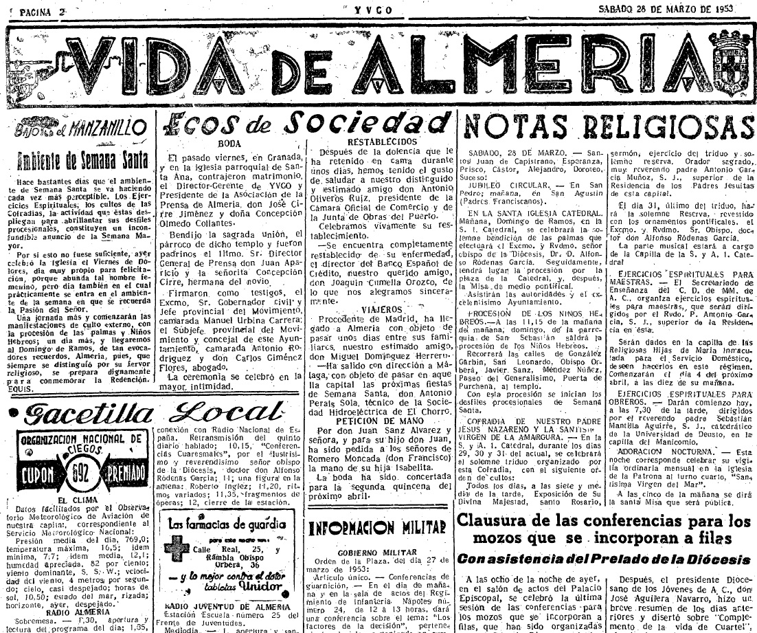 #BajoelManzanillo nos traslada a los preparativos de la Semana Santa del año 1953, que contó con el estreno en Almería de la película ‘Cerca del cielo’ (1951) y una charla del protagonista, padre Venancio Marcos, figura mediática, conocido en los ámbitos de la prensa, la radio y el cine. Las hermandades preparaban sus desfiles procesionales coordinadas por la Agrupación de Cofradías, que llevaba seis años de vida (fundada en 1947)