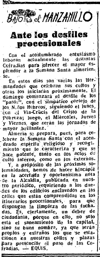 Una jornada más y comenzarán las manifestaciones de culto externo, con la procesión de las palmas y Niños Hebreos; un día más, y llegaremos al Domingo de Ramos, de tan evocadores recuerdos. Almería, pues, que siempre se distinguió por su fervor religioso, se prepara dignamente para conmemorar la Redención.
