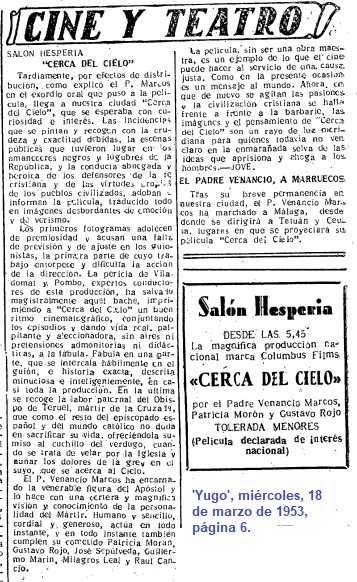 NOTA.- Imágenes destacadas de portada. Corresponden a dos de los carteles del anuncio del estreno de la película ‘Cerca del cielo‘, en 1951, aunque a Almería no llegó el film hasta 1953, en vísperas de la Semana Santa. Y, en el centro, una caricatura del padre Venancio Marcos, obra del periodista, pintor y dibujante Diego Domínguez Herrero, ilustración de ‘Yugo‘