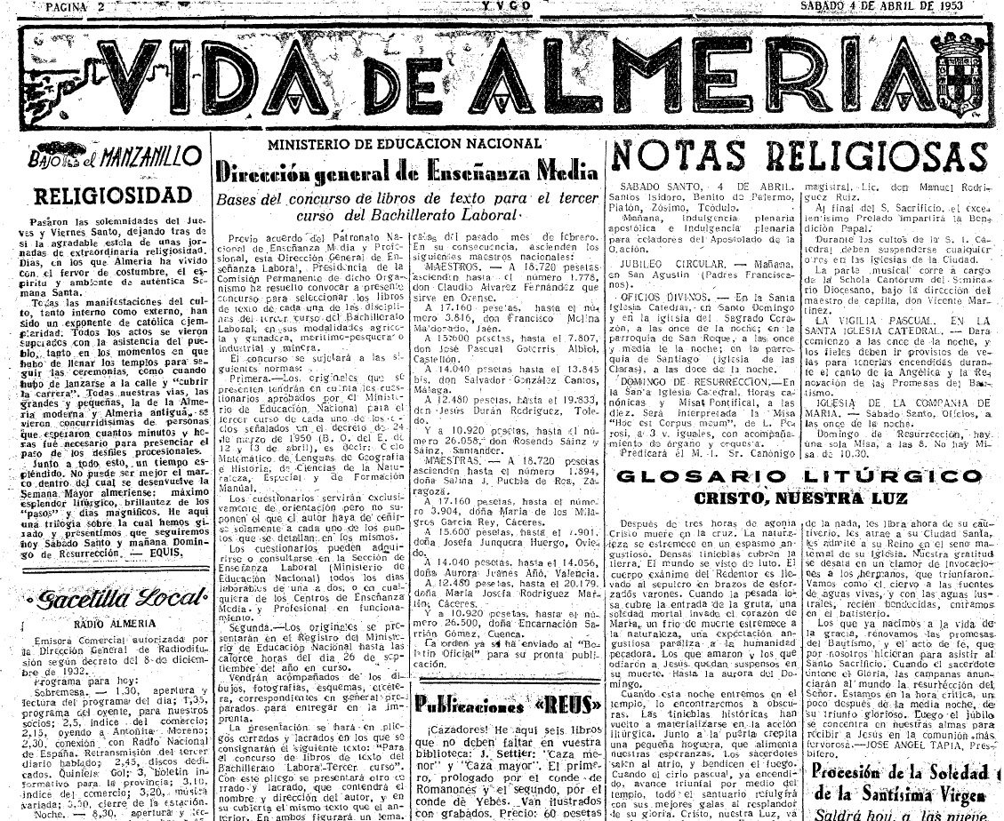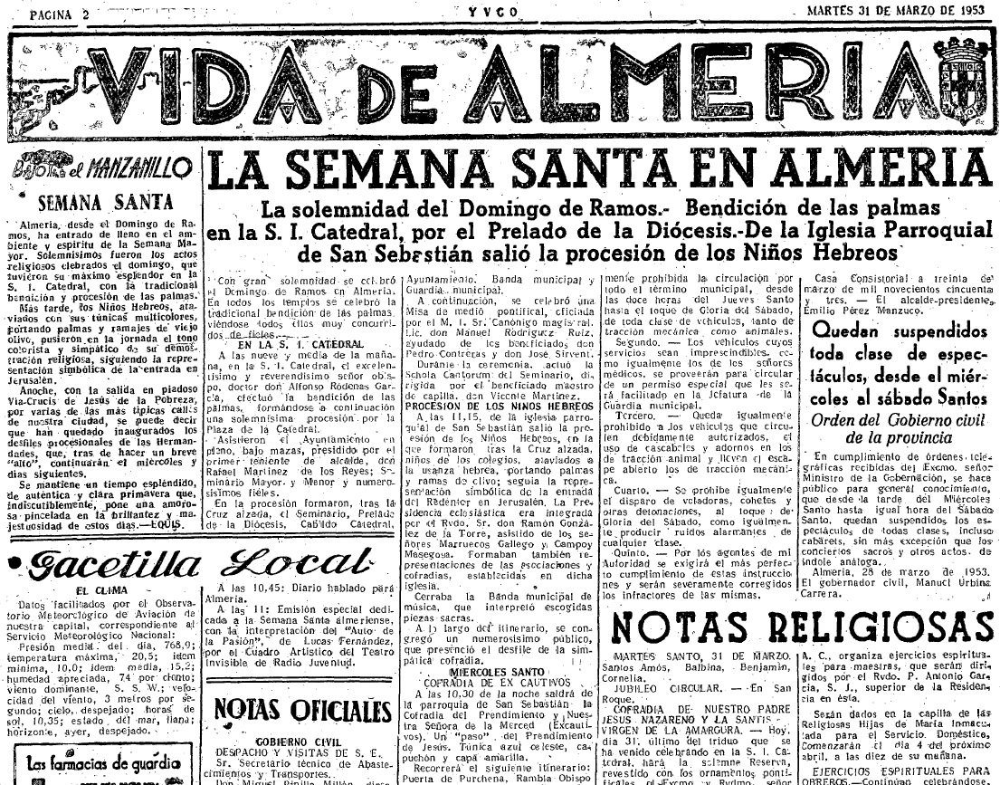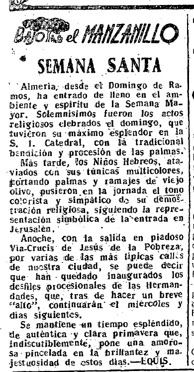 #BajoelManzanillo nos remonta a la Semana Santa de 1953: diez cofradías organizaban los desfiles procesionales. Recordamos los ya desaparecidos, dos vía crucis de Nuestro Padre Jesús de la Pobreza, y la procesión de mujeres de la Soledad de la Virgen, los lunes, jueves y sábados santo, respectivamente. Mención a las prohibiciones y la Ley de Ayuno y Abstinencia. Y, el final de la semana mayor, sin imagen del Resucitado, pero con un concierto de música y una exhibición ‘paracaidística‘ que congregó a miles de almerienses. Lorenzo Gallardo dejaba la presidencia de la Agrupación de Cofradías al entonces alcalde, Emilio Pérez Manzuco
