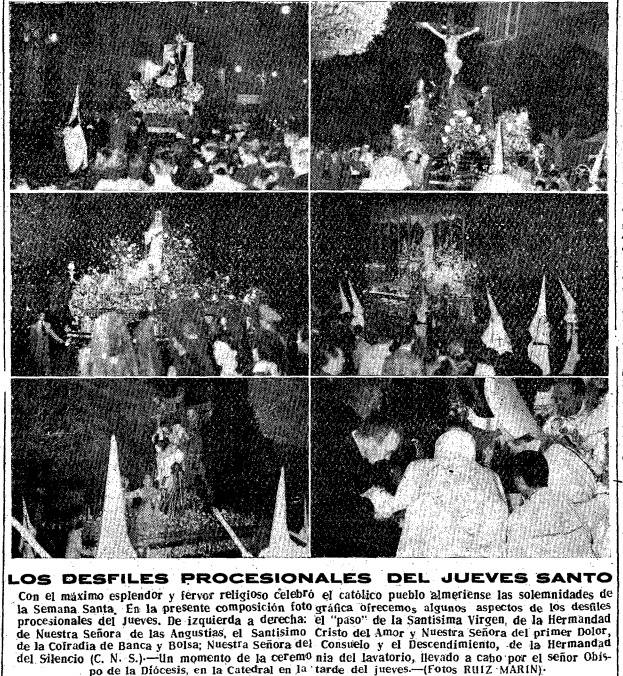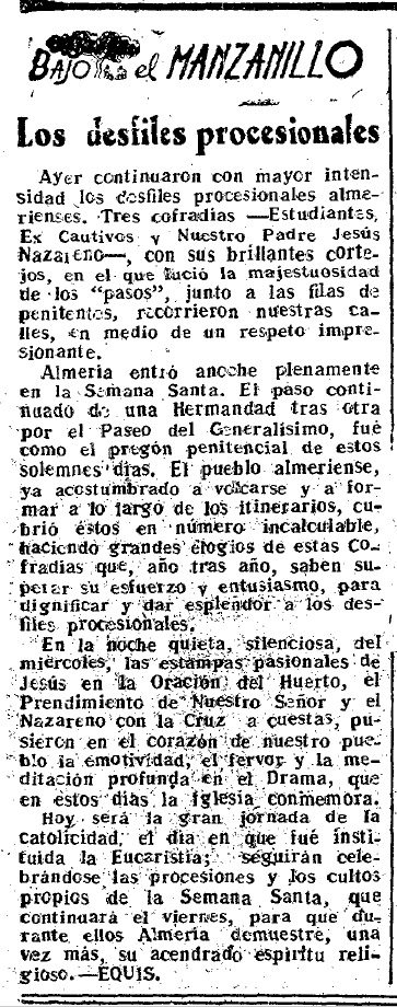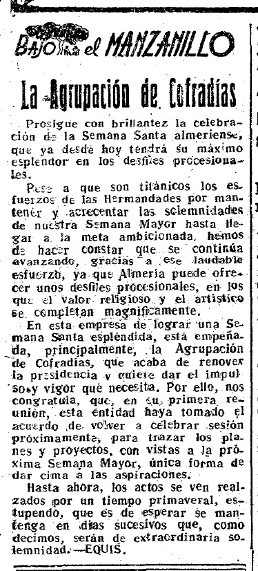 Pese a que son titánicos los esfuerzos de las Hermandades por mantener y acrecentar las solemnidades de nuestra Semana Mayor hasta llegar a la meta ambicionada, hemos de hacer constar que se continua avanzando, gracias a este laudable esfuerzo, ya que Almería puede ofrecer unos desfiles procesionales, en los que el valor religioso y el artístico se completan magníficamente.