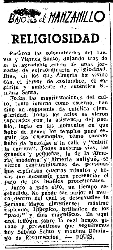 Todas las manifestaciones del culto, tanto interno como externo, han sido un exponente de católica ejemplaridad. Todos los actos se vieron superados con la asistencia del pueblo, tanto en los momentos en que hubo de llenar los templos para seguir las ceremonias, como cuando hubo de lanzarse a la calle y «cubrir la carrera». Todas nuestras vías, las grandes y pequeñas, la de la Almería moderna y Almería antigua, se vieron concurridísimas de personas que esperaron cuantos minutos y horas fue necesario para presenciar el paso de los desfiles procesionales.
