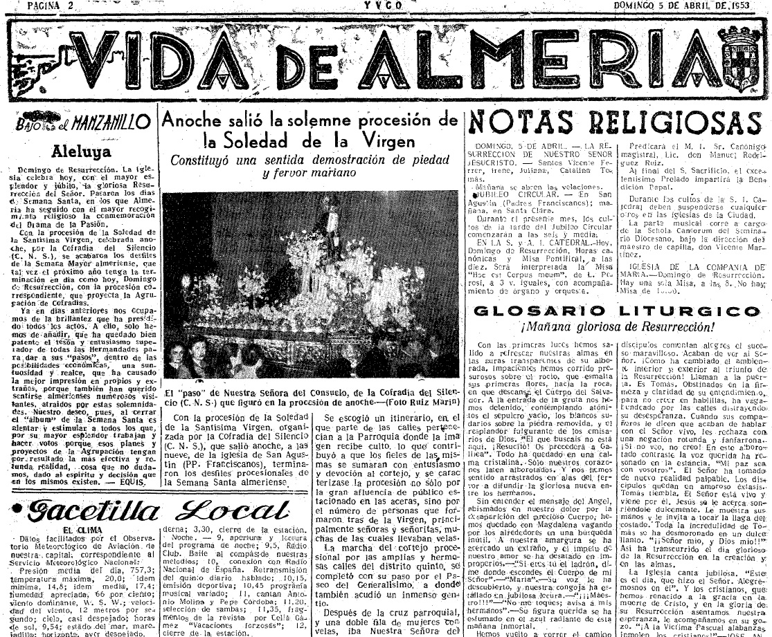 Junto a todo esto, un tiempo espléndido. No puede ser mejor el marco dentro del cual se desenvuelve la Semana Mayor almeriense: máximo esplendor litúrgico, brillantez de los «pasos» y días magníficos. He aquí una trilogía sobre la cual hemos girado y presentimos que seguiremos hoy Sábado Santo y mañana, Domingo de Resurrección.