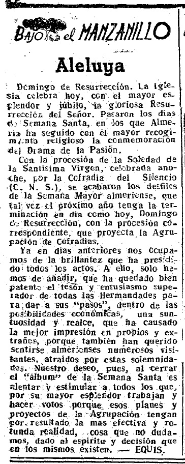 Ya en días anteriores, nos ocupamos de la brillantez que ha presidido todos los actos. A ello, solo hemos de añadir, que ha quedado bien patente el tesón y entusiasmo superador de todas las Hermandades para dar a sus «pasos», dentro de las posibilidades económicas, una suntuosidad y realce, que ha causado la mejor impresión en propios y extraños, porque también han querido sentirse almerienses numerosos visitantes, atraídos por estas solemnidades. Nuestro deseo, pues, al cerrar el «álbum» de la Semana Santa es alentar y estimular a todos los que, por su mayor esplendor trabajan y hacer votos porque esos planes y proyectos de la Agrupación tengan por resultado la más efectiva y rotunda realidad, cosa que no dudamos, dado el espíritu y decisión que en los mismos existen.