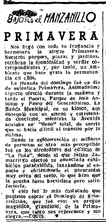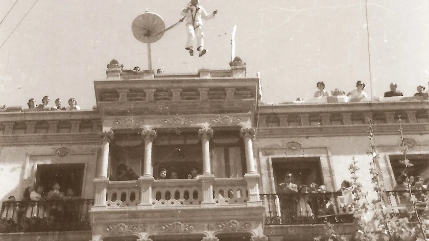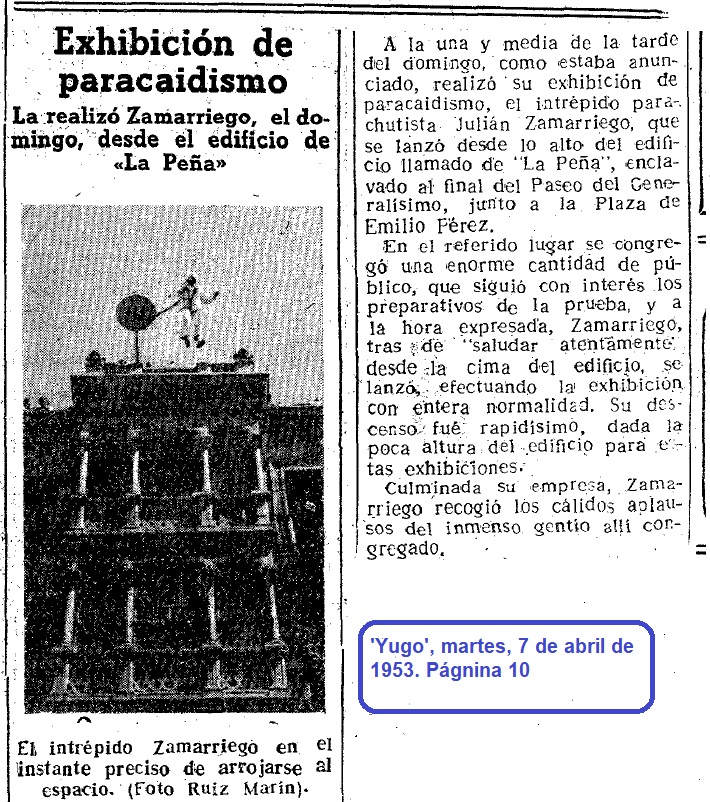 Donde la aglomeración de millares de personas se hizo más perceptible fue en los alrededores del edificio de «La Peña», desde el que Julián Zamarriego efectuó su anunciada exhibición paracaidística, lanzándose al espacio y abriéndosele el paracaídas muy cerca del suelo, lo que hizo que la prueba fuese brevísima pero satisfactoria.
