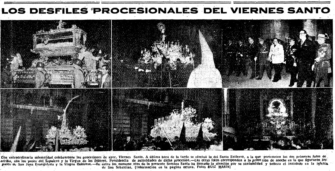 Almería entró anoche plenamente en la Semana Santa. El paso continuado de una Hermandad tras otra por el Paseo del Generalísimo -hoy, Paseo de Almería-, fue como el pregón penitencial de estos solemnes días. El pueblo almeriense, ya acostumbrado a volcarse y a formar a lo largo de los itinerarios, cubrió éstos en número incalculable, haciendo grandes elogios de estas Cofradías que, año tras año, saben superar su esfuerzo y entusiasmo, para dignificar y dar esplendor a los desfiles procesionales.