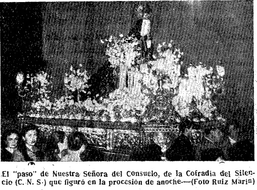 En esta empresa de lograr una Semana Santa espléndida, está empeñada, principalmente, la Agrupación de Cofradías -fundada en 1947-, que acaba de renovar la presidencia y quiere dar un impulso y vigor que necesita. Por ello, nos congratula, que, en su primera reunión, esta entidad haya tomado el acuerdo de volver a celebrar sesión próximamente, para trazar los planes y proyectos, con vistas a la próxima Semana Mayor, única forma de dar cima a las aspiraciones.