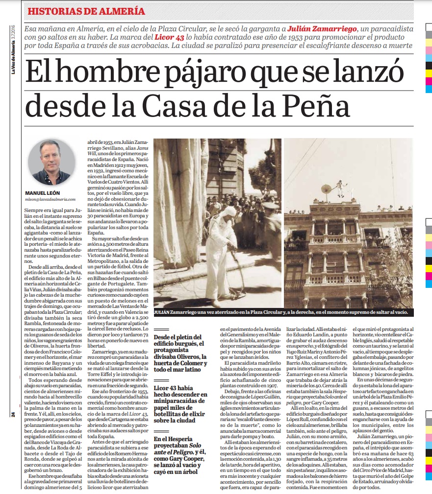 El hombre pájaro que se lanzó desde la Casa de la Peña (Por Manuel León. La Voz de Almería, 3 de julio de 2016)