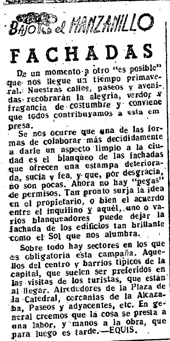 #BajoelManzanillo nos lleva a 1953 cuando la limpieza en la ciudad comenzaba a ser una preocupación por la falta de colaboración ciudadana. Se pedía más vigilancia y sanciones «a quienes, sin escrúpulos, ven en la vía pública, lugar propicio para ejecutar desagües». También se hacía una llamada a propietarios e inquilinos de edificios para conservar debidamente las fachadas, una obligación en ciertos sectores. Para ello, el Ayuntamiento aprobó una ordenanza a fin de poder realizar cuantas «reformas se estimen convenientes en edificios particulares, sin tener que recurrir a solicitudes y concesiones», que, a veces, se retrasaban en exceso
