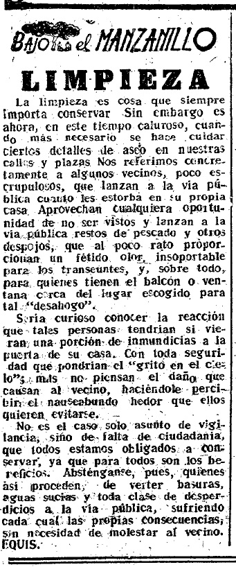La limpieza es cosa que siempre importa conservar. Sin embargo es ahora, en este tiempo caluroso, cuando más necesario se hace cuidar ciertos detalles de aseo en nuestras calles y plazas. Nos referimos concretamente a algunos vecinos, poco escrupulosos, que lanzan a la vía pública cuanto les estorba en su propia casa. Aprovechan cualquier oportunidad de no ser vistos y lanzan a la vía pública restos de pescado y otros despojos, que al poco rato proporcionan un fétido olor, insoportable para los transeúntes, y, sobre todo, para quienes tienen el balcón o ventana cerca del lugar escogido para tal «desahogo».