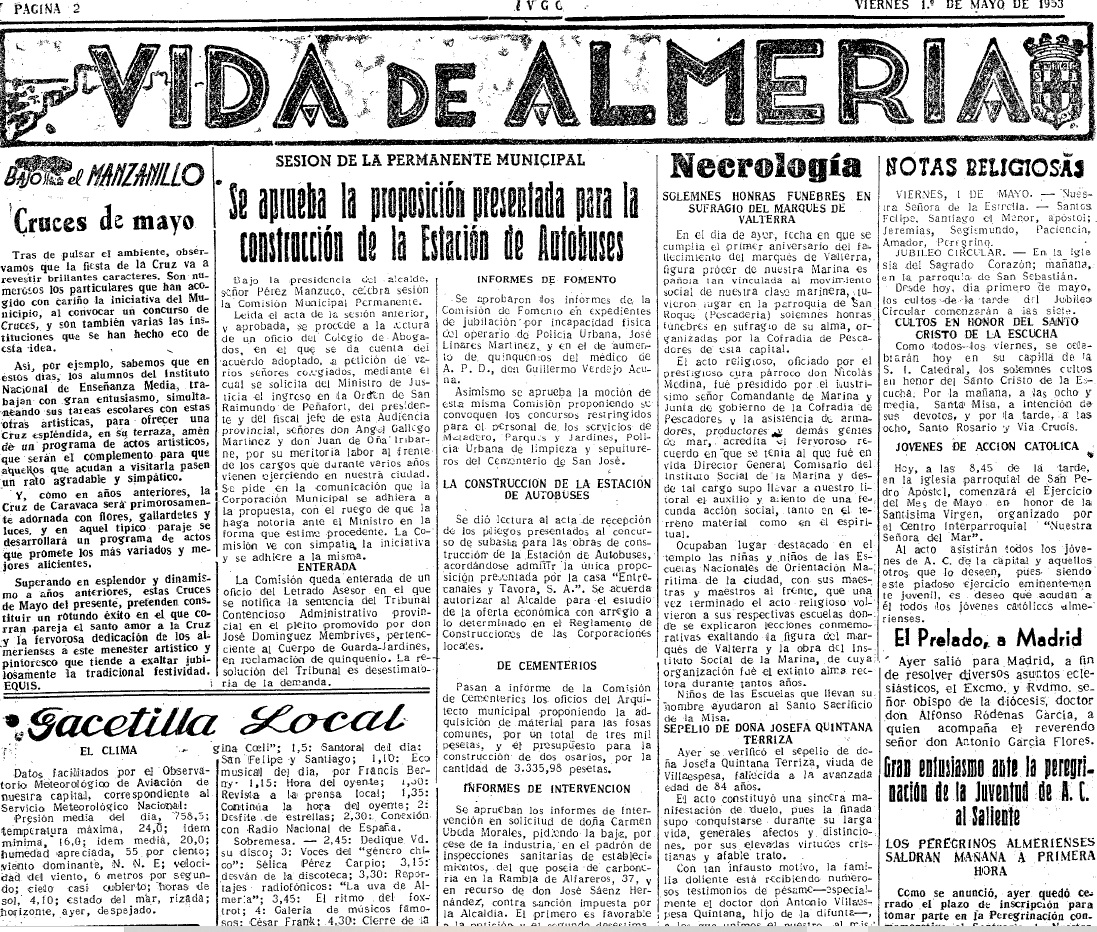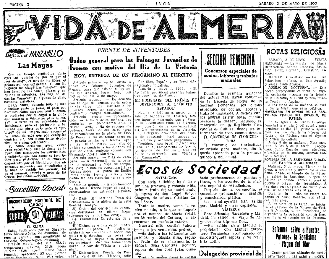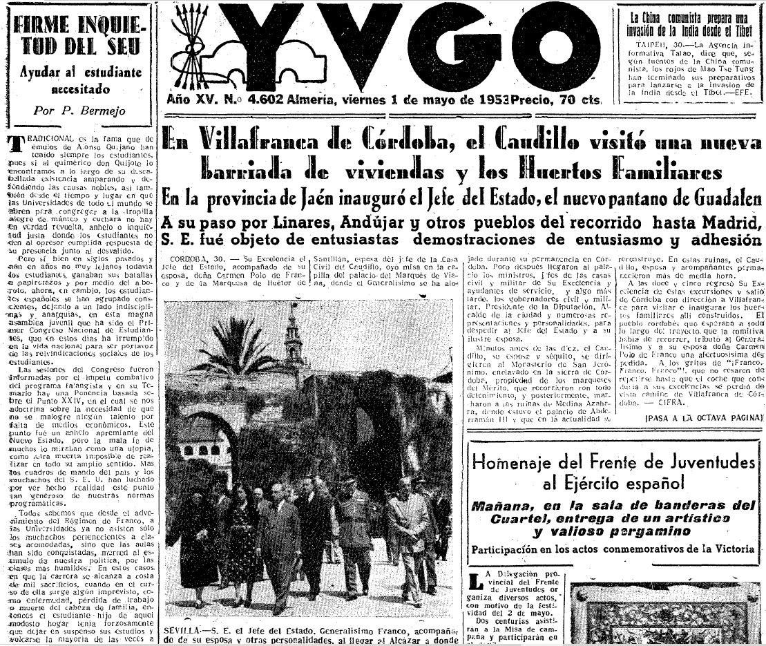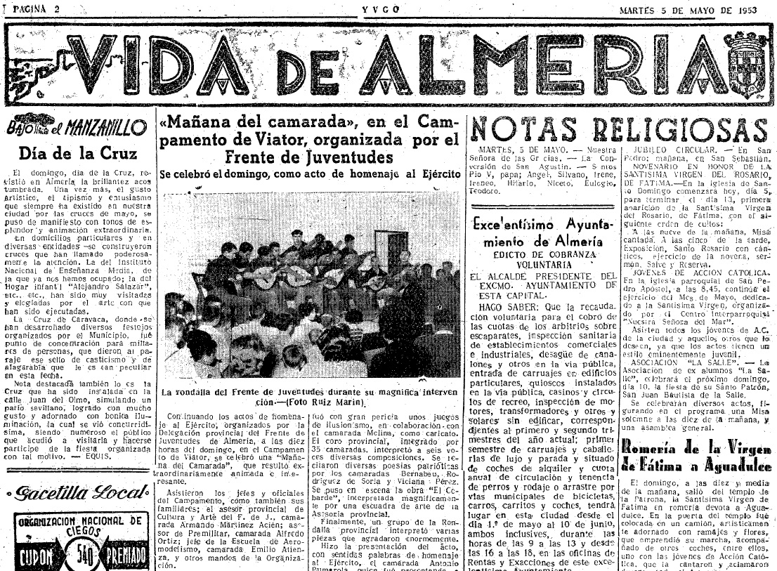 NOTA.- La fotografía destacada, de portada, cuyo autor es RUIZ MARÍN, corresponde a la fiesta de la cruz instalada en el Instituto Nacional de Enseñanza Media de Almería, en 1955. Fue publicada por el diario ‘Yugo’.