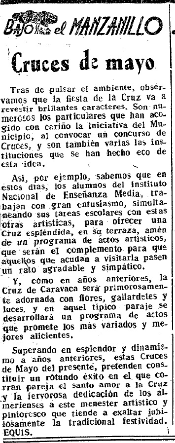 Tras de pulsar el ambiente, observamos que la fiesta de la Cruz va a revestir brillantes caracteres. Son numerosos los particulares que han acogido con cariño la iniciativa del Municipio, al convocar un concurso de cruces, y son también varias las instituciones que se han hecho eco de esta idea.