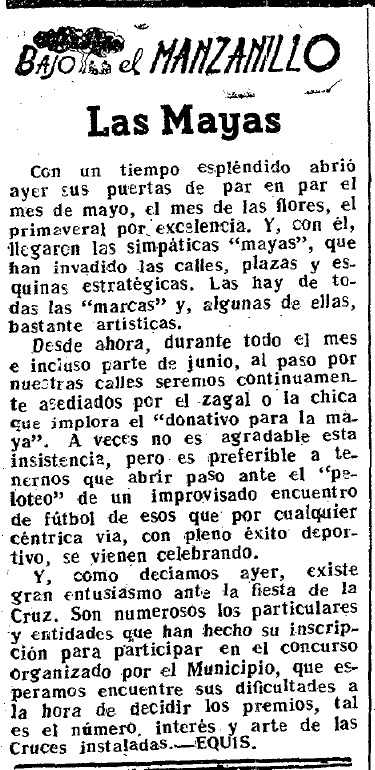 Desde ahora, durante todo el mes e incluso parte de junio, al paso por nuestras calles seremos continuamente asediados por el zagal o la chica que implora el «donativo para la maya». A veces no es agradable esta insistencia, pero es preferible a tenernos que abrir paso ante el «peloteo» de un improvisado encuentro de fútbol de esos que por cualquier céntrica vía, con pleno éxito deportivo, se vienen celebrando.