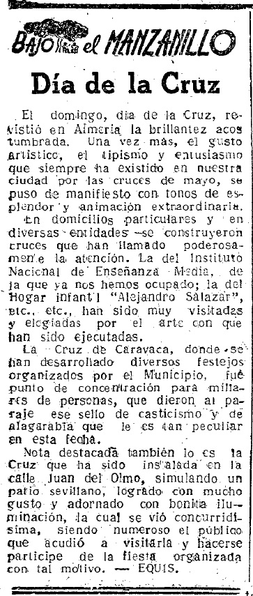 Superando en esplendor y dinamismo a años anteriores, estas Cruces de mayo del presente, pretenden constituir un rotundo éxito en el que corran pareja el santo amor a la Cruz y la fervorosa dedicación de los almerienses a este menester artístico y pintoresco que tiende a exaltar jubilosamente la tradicional festividad.