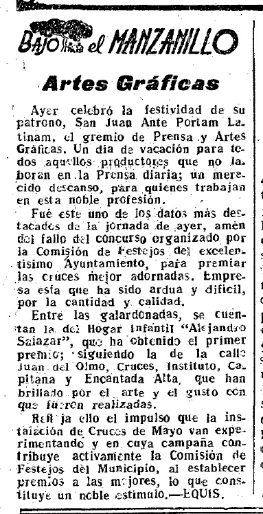 Ayer celebró la festividad de su patrón, San Juan Ante Portam Latinam, el gremio de Prensa y Artes Gráficas. Un día de vacación para todos aquellos productores que no laboran en la Prensa diaria; un merecido descanso, para quienes trabajan en esta noble profesión.