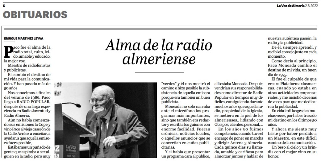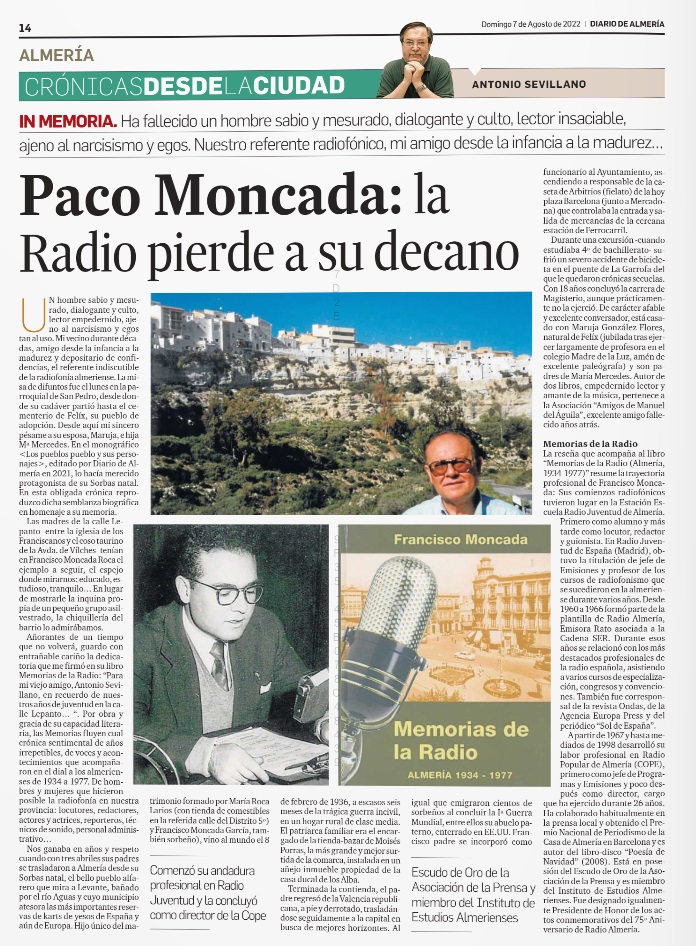 Francisco Moncada Roca, toda una vida dedicada a la radio, maestro y referente del periodismo radiofónico almeriense, del que era decano, fallecía en la tarde del 31 de julio de 2022, a la edad de 86 años, en Almería. Sus restos están siendo velados en el Tanatorio de Almería, sala 3, y la misa por su alma se celebrará en la iglesia parroquial de san Pedro, este martes, 2 de agosto, a las 11 horas. Será enterrado en Felix.