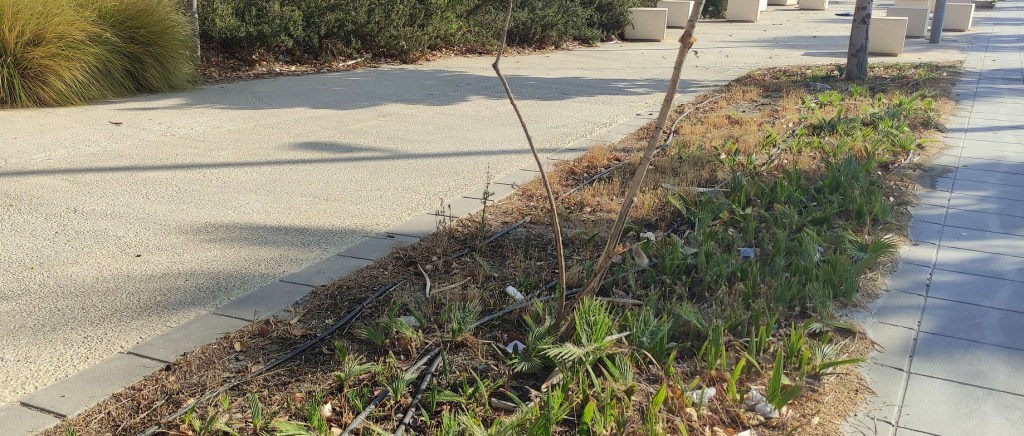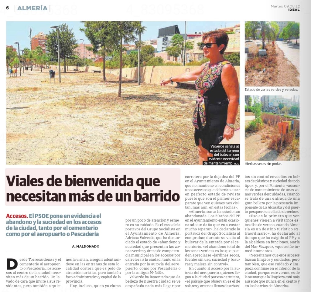 El parque de acceso por Pescadería necesita una acción urgente de choque en cuanto a limpieza y jardinería. Es urgente, porque el espectáculo de dejadez es mayúsculo. Este lunes, 8 de agosto, a las 9:30 de la mañana, la situación era desoladora. El martes, 9 de agosto, la empresa concesionaria del servicio de limpieza de la ciudad, envió a dos trabajadores con un camión para proceder al barrido y recogida de basura de los espacios peatonales y carril bici, no así de las zonas ajardinadas o en secarral. La fuente, surtidores de agua, sigue sin funcionar. Si comparamos con imágenes de noviembre de 2019, se nos cae todo al suelo. No hay justificación para tanta falta de mantenimiento y limpieza, independiente del incivismo de vecinos o visitantes. hay que devolver a Pescadería el recinto para el descanso que tanto necesita y potenciar su buen uso.