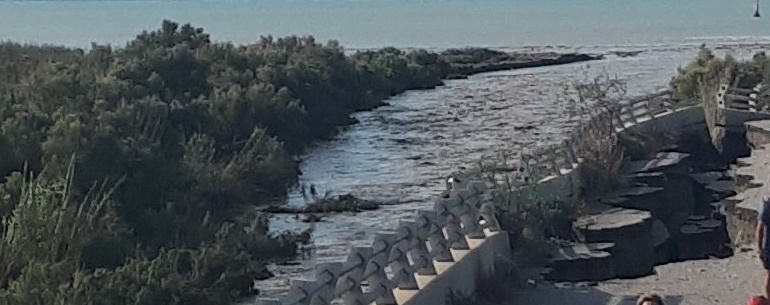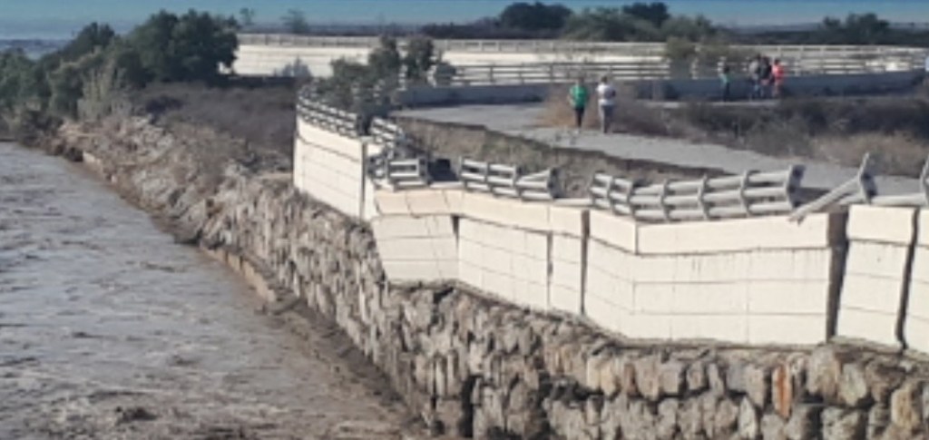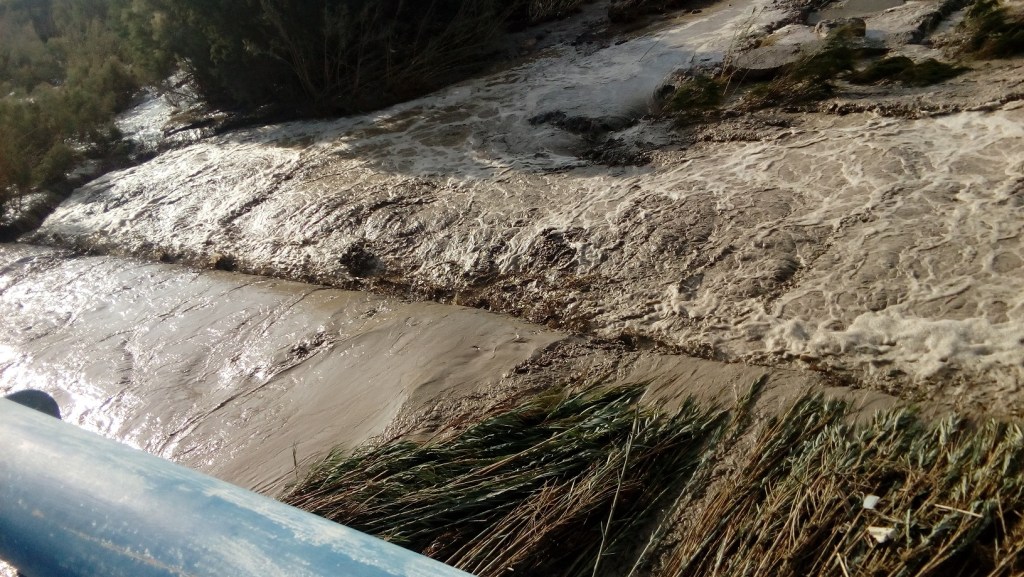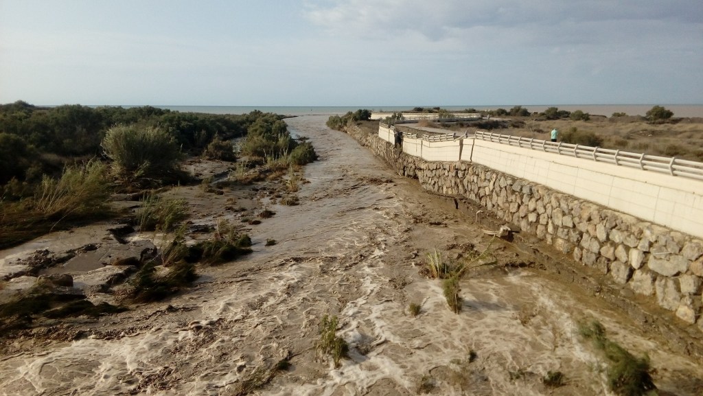 Un mes más tarde, el 13 de septiembre, también en Facebook, registrábamos el siguiente comentario bajo el título de «Gota fría: Cuando no somos conscientes del riesgo«: «A veces, en situaciones como las de esta pasada madrugada en Almería por las lluvias caídas consecuencia de la gota fría, corremos unos riesgos innecesarios que podrían evitarse. Pero no somos conscientes de ello. Esta misma mañana, sobre las 10 horas, en la desembocadura del río Andarax, cuyo caudal iba de parte a parte, en toda su extensión y con una fuerza que impresionaba (bien es cierto que la altura del agua había bajado como un metro, por el rastro dejado). Al salir el agua del puente sobre la avenida de Cabo de Gata, debido a la enorme vegetación allí acumulada del abandono que ya hemos denunciado otras veces, el caudal azotaba el muro del margen de poniente del río camino de su desembocadura con las consecuencias lógicas: derrumbe de los cimientos del propio muro (a las 10:05 h.), desplome de la barandilla de obra (a continuación), y desaparición de parte del camino (ya estaba afectado) que discurre por esa zona hasta el delta. Una situación peligrosa que muchos, incluso un padre con sus hijos sin colegio y algún adulto y persona mayor, se expusieron corriendo un riesgo innecesario a escasos metros de la zona de los derrumbes y deambulando por el camino que quedaba. Nos pierde el ansia de fotografiar y grabar vídeos. Hasta que tras una llamada al 112, la Policía Local intervino y controló la situación. Hay que ser precavidos y aceptar los consejos de las autoridades y administraciones competentes. La verdad es que si el cauce del río hubiese estado limpio, como desde aquí mismo hemos demandado desde hace más de un mes, el río hubiera salido por su curso normal sin afectar a los márgenes, ni encontrar obstáculos en su camino al mar. Las fotos, tomadas entre las 10 y las 10.30 de la mañana de este 13 de septiembre de 2019, con móvil, dan idea del riesgo que muchos corrieron sin necesidad«.