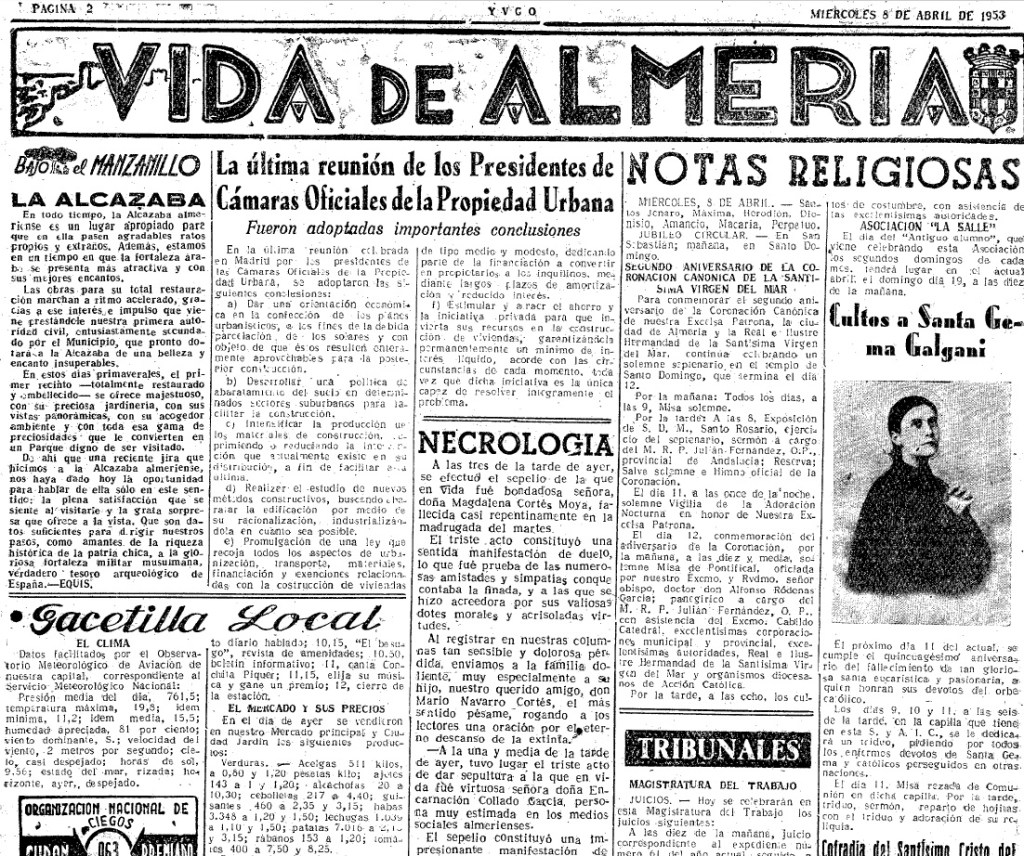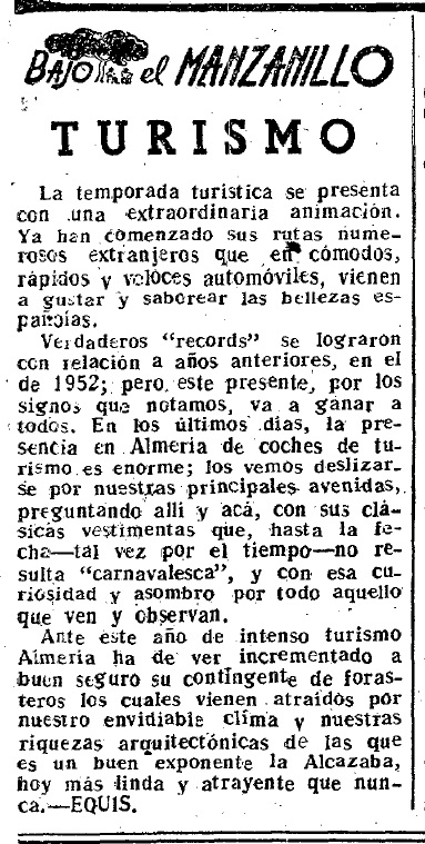 #BajoelManzanillo, en plena primavera de 1953, destacaba la apuesta de Almería por el turismo, con cifras que iban creciendo y captaban a «forasteros los cuales vienen atraídos por nuestro envidiable clima y nuestras riquezas arquitectónicas». Reflejaba el protagonismo de la Alcazaba, cuya restauración del primer recinto se ofrecía «majestuosa»; del Parque, que en abril «recobra su frondosidad y hermosura», y de la Glorieta de San Pedro, «una de las más típicas y artísticas de nuestra ciudad»