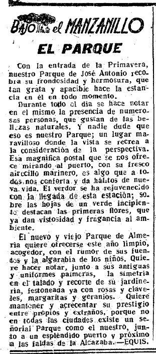 El nuevo y viejo Parque de Almería quiere ofrecerse este año limpio, acogedor, con el rumor de sus fuentes y la algarabía de los niños. Quiere hacer notar, junto a sus antiguas y uniformes palmeras, la simetría en el talado y recorte de su jardinería, festoneada ya con rosas y claveles, margaritas y geranios. Quiere mantener y acrecentar su prestigio entre propios y extraños, porque no en todas las ciudades existe un señorial Parque como el nuestro, junto a un espléndido puerto y próximo a las faldas de la Alcazaba.