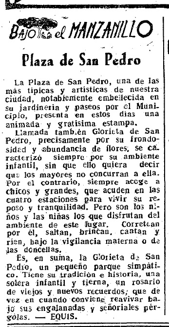 Es, en suma, la Glorieta de San Pedro, un pequeño parque simpático. Tiene su tradición e historia, una solera infantil y tierna, un rosario de viejos y nuevos recuerdos; que, de vez en cuando, conviene reavivar bajo sus engalanadas y señoriales pérgolas.