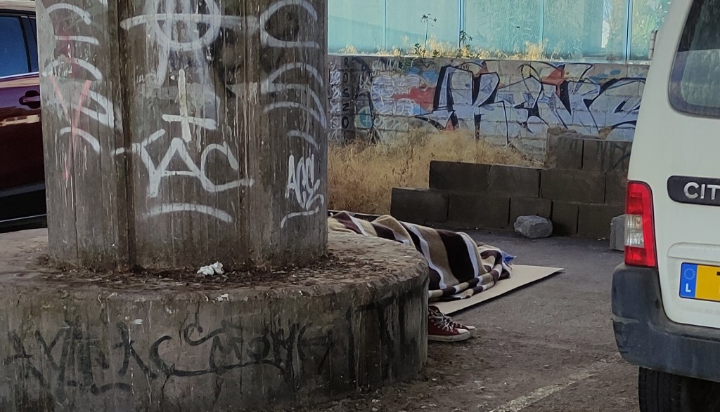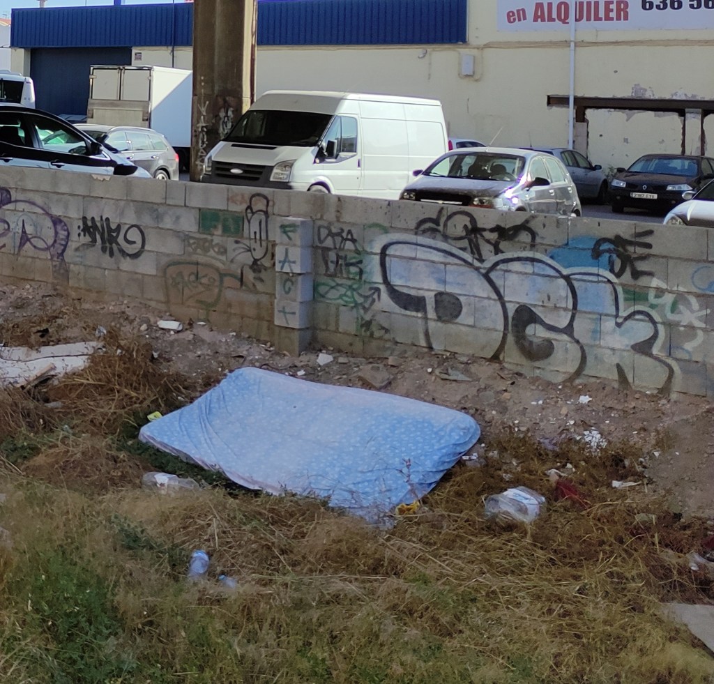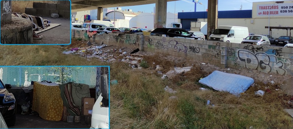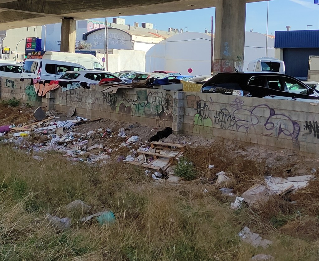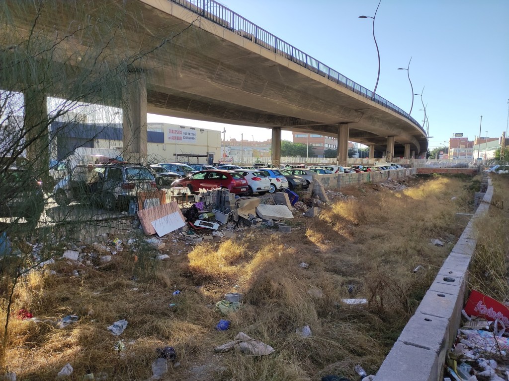 La situación del solar bajo el Puente de la avenida del Mediterráneo, en la avenida de Montserrat, es insostenible para las personas que malviven, quienes aparcan, los que usan la gasolinera y, sobre todo, los que se alojan en la Residencia Universitaria Civitas. Fotografías tomadas a las 9:15 horas.- Fotos JOMARO