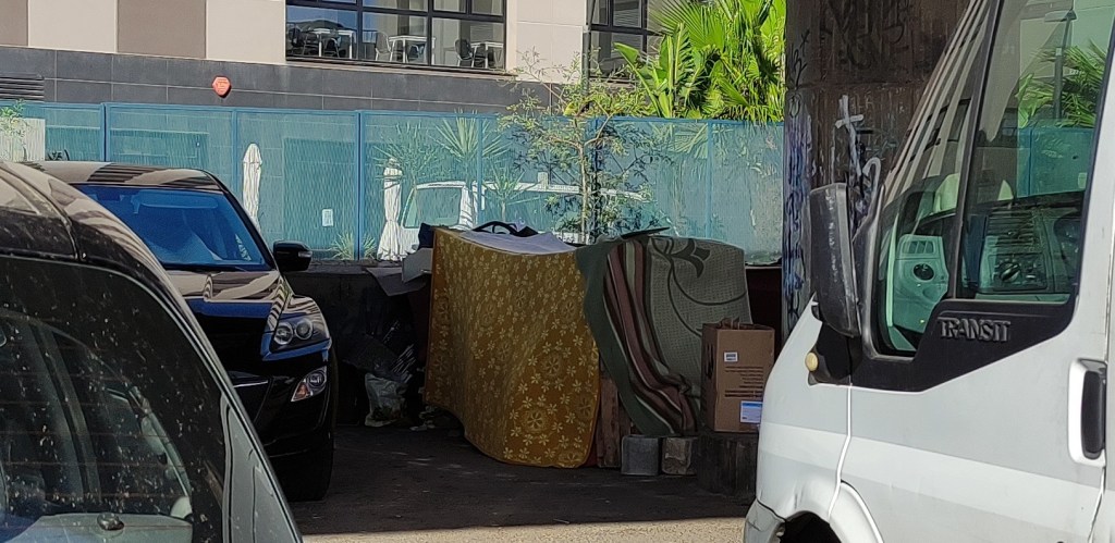 Poco a poco, desde entonces, como en ningún momento se ha afrontado el vallado como es debido del solar, la situación ha ido empeorando y recuperando su viejo aspecto, incluso peor. De un poco de basura arrojada al espacio abierto recién limpio, fueron después llegando algunos escombros, y más adelante artilugios, residuos y basuras de todo tipo. Ha pasado el verano con un olor casi insoportable para quienes hemos transitado por allí, pero ya, en los últimos días, el aspecto que toma la zona es de un gran foco de infección con todas las consecuencias lógicas. Los universitarios, que tienen sus ventanas a dos metros, no pueden abrirlas; quienes aparcan, dejan el coche y salen huyendo; los que pasan a la gasolinera, observan estupefactos; y, sobre todo, lo peor, que hemos comprobado esta misma mañana -24 de septiembre de 2022-, es que malviven allí personas. Al menos dos, por separado, un hombre y una mujer. El primero junto a una de las columnas, y la segunda, en una especie de chabola que se ha levantado. Allí hace vida y hasta lava su ropa. Es una situación grave que requiere de la actuación de los servicios sociales municipales.