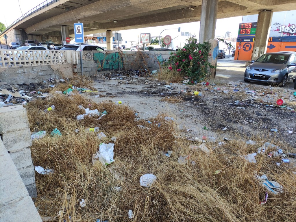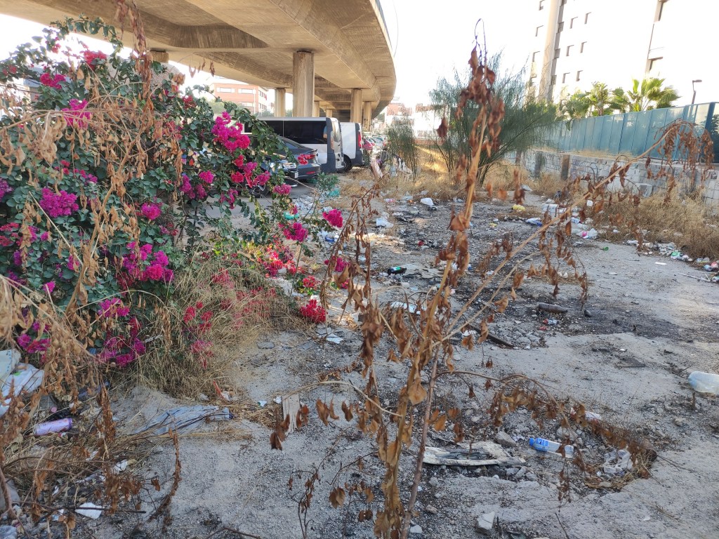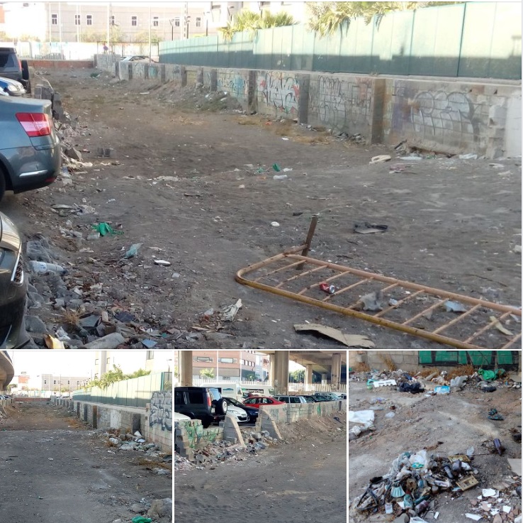 Desde las redes sociales, el 26 de julio de 2019, denunciamos el estado del solar, cuando escribíamos: «Nos come la porquería bajo el puente. Juzguen las imágenes. Justo debajo del puente de la avenida del Mediterráneo, en su confluencia con la avenida Nuestra Señora de Montserrat, limitando con la fachada trasera de la Residencia Universitaria Civitas (las ventanas de casi todas sus habitaciones dan allí) y con el improvisado aparcamiento de coches de toda la vida. Allí, hay una franja, un solar sin prácticamente protección ni valla, municipal o no, lo desconocemos, donde se acumulan basuras, desperdicios, desechos, inmundicia, con un olor pestilente, más acentuado en verano, donde la porquería nos come en una zona relativamente céntrica. Tanto si es municipal como si no lo es, el ayuntamiento de Almería, debe tomar cartas en el asunto y exigir cuanto menos: limpieza, vallado, etc. Y, de lo contrario, ganarle eso al espacio urbano».