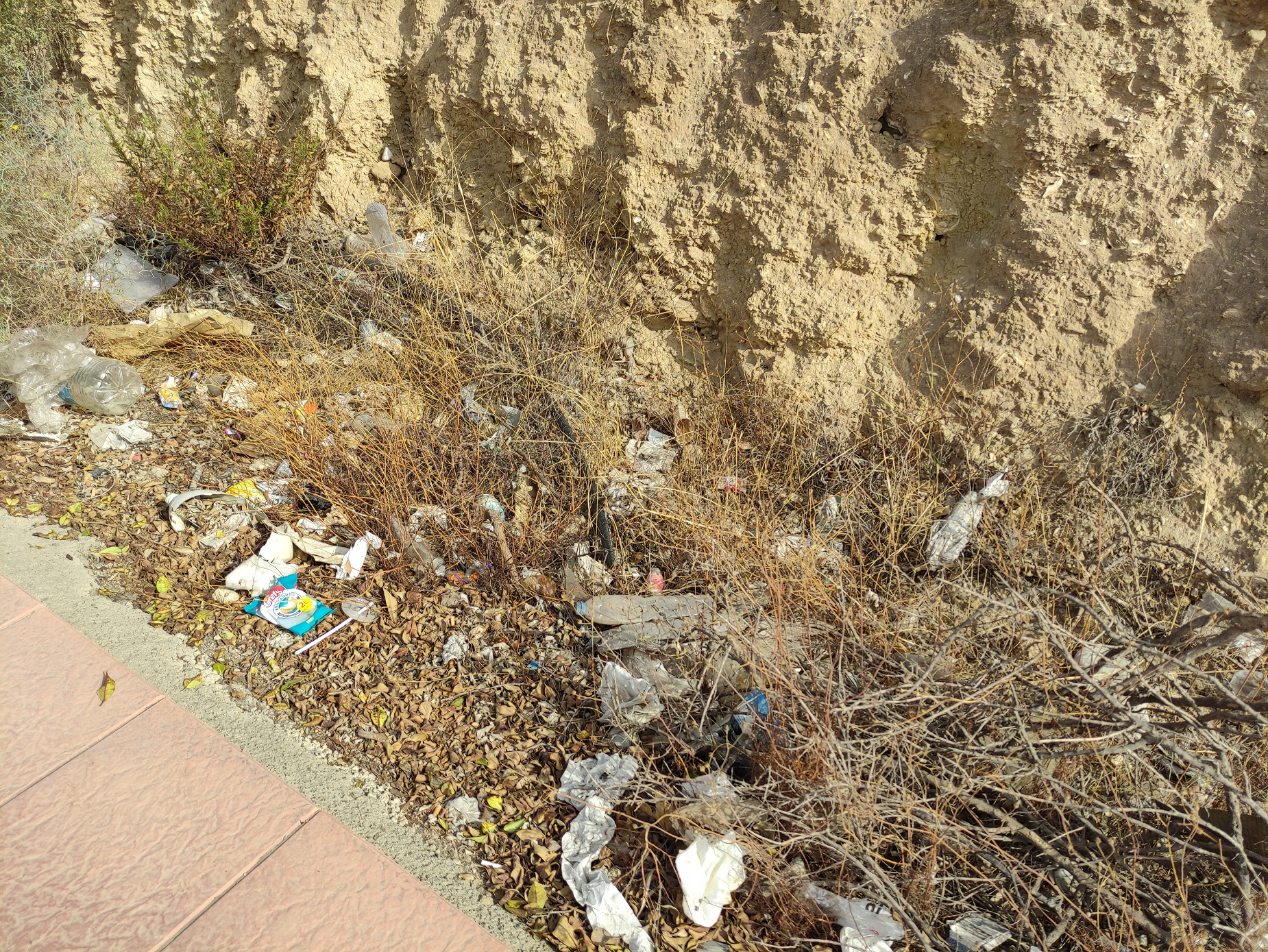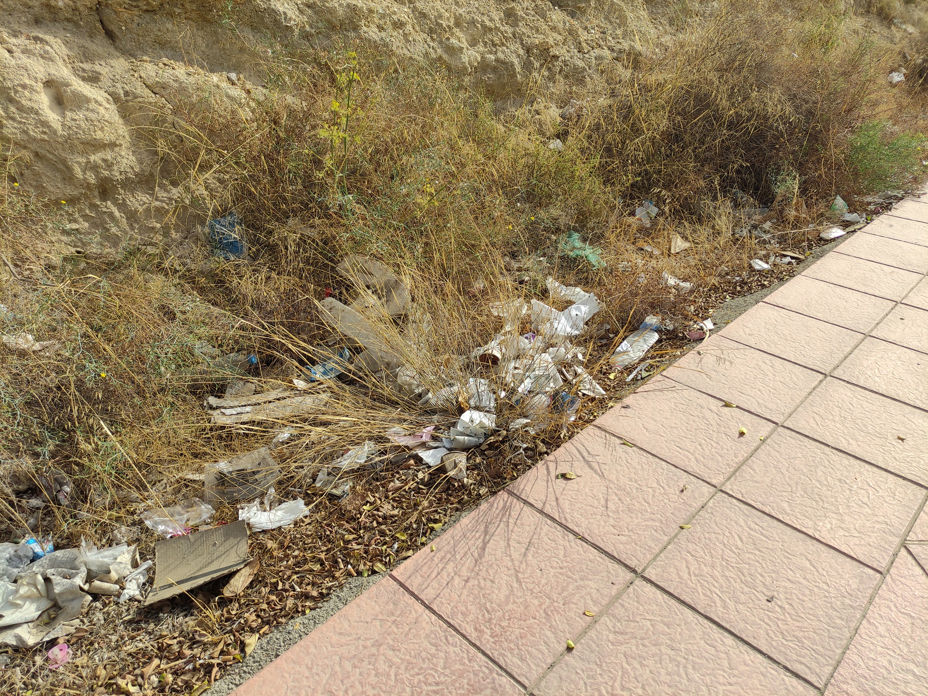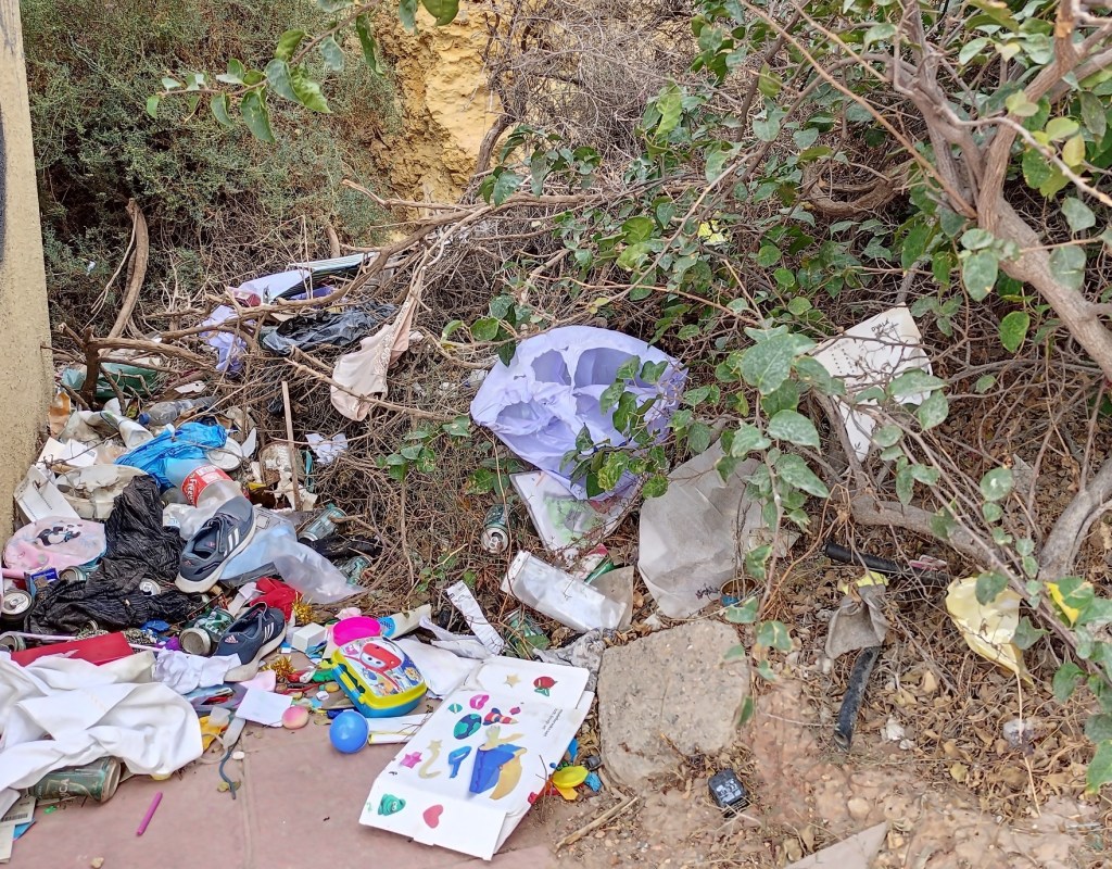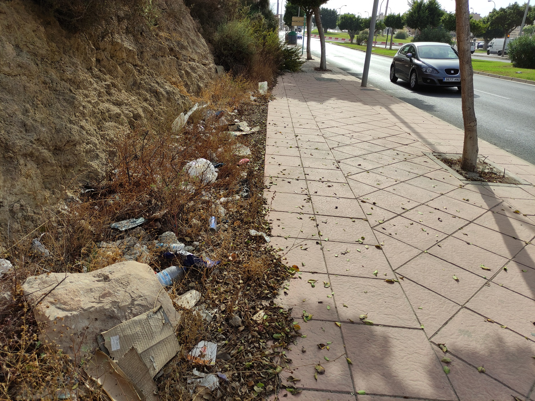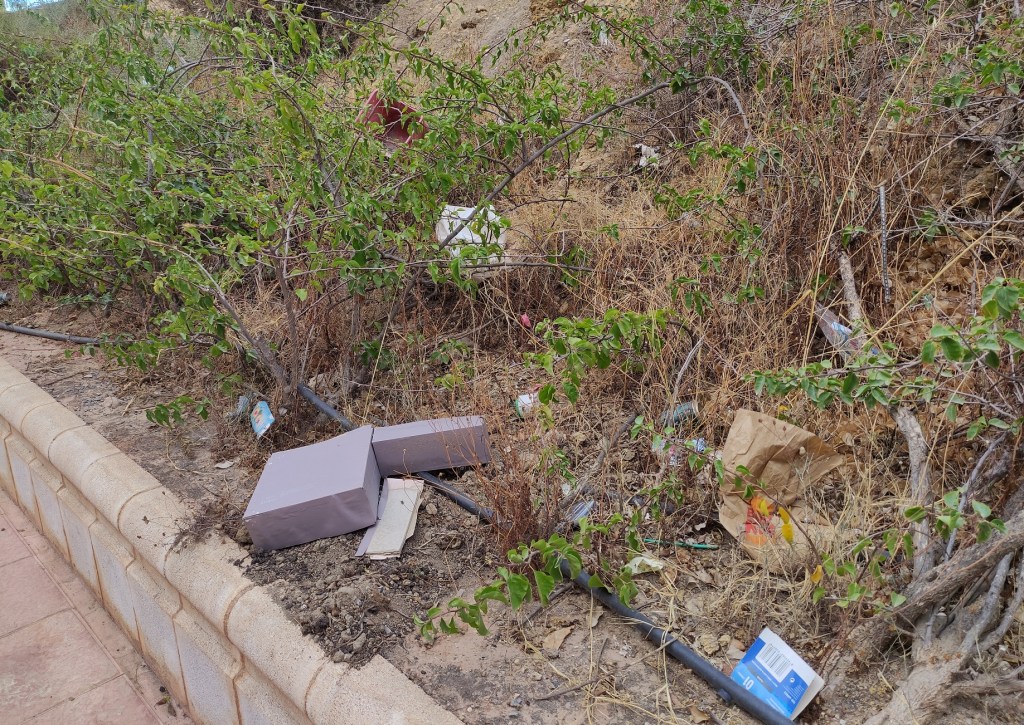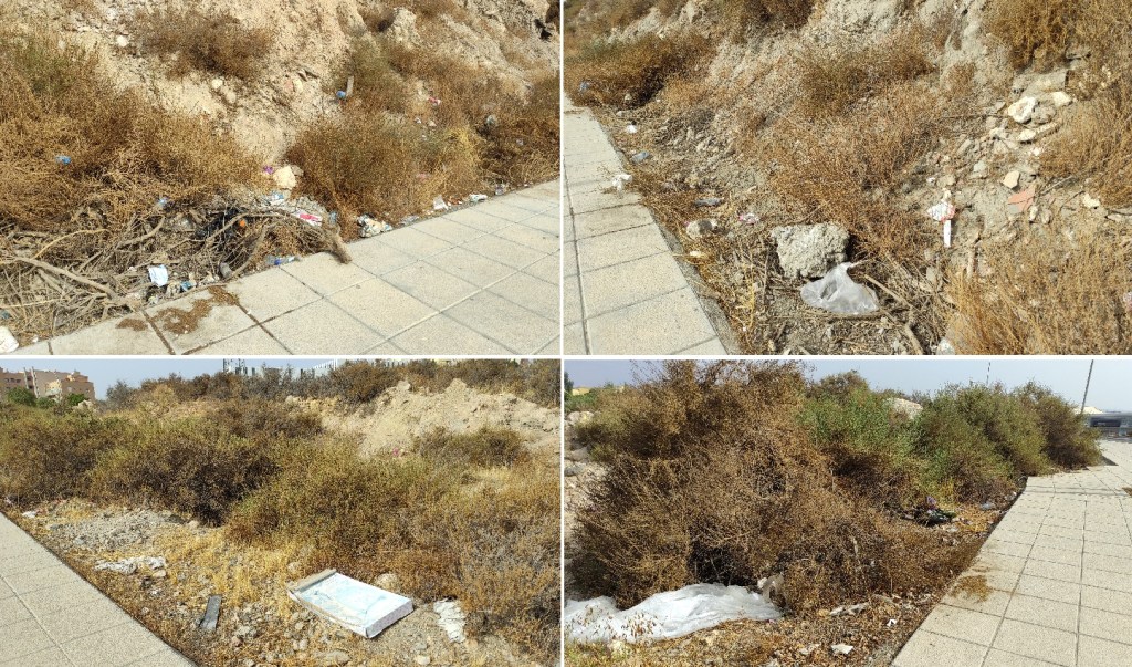 Un simple paseo, andando o en vehículo, por la avenida Torrecárdenas o la calle Hermanos Siret, hacen esquina, lindando con los aparcamientos y con algunos edificios del complejo hospitalario y diversos pisos que ya están habitados, nos da una idea de la dimensión de la suciedad almacenada entre maleza, sin control alguno, en la ladera del mismo cerro. Hay basura de cualquier tipo que pueda uno imaginarse, ya acumulada de hace tiempo, sobre todo objetos de plástico; residuos, prendas de vestir -hasta ropa interior-, edredones, colchonetas, mascarillas, vallas abandonadas, envases de cartón, etc. ¡Tremendo!