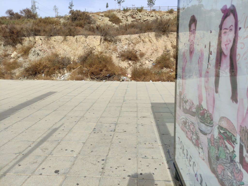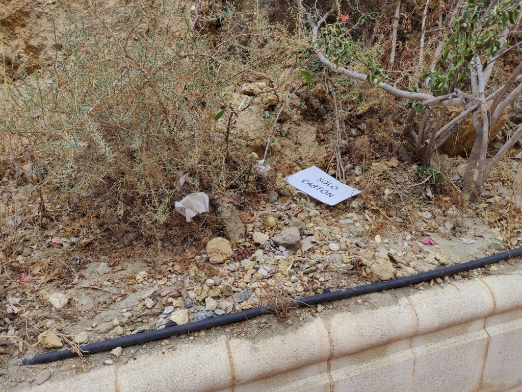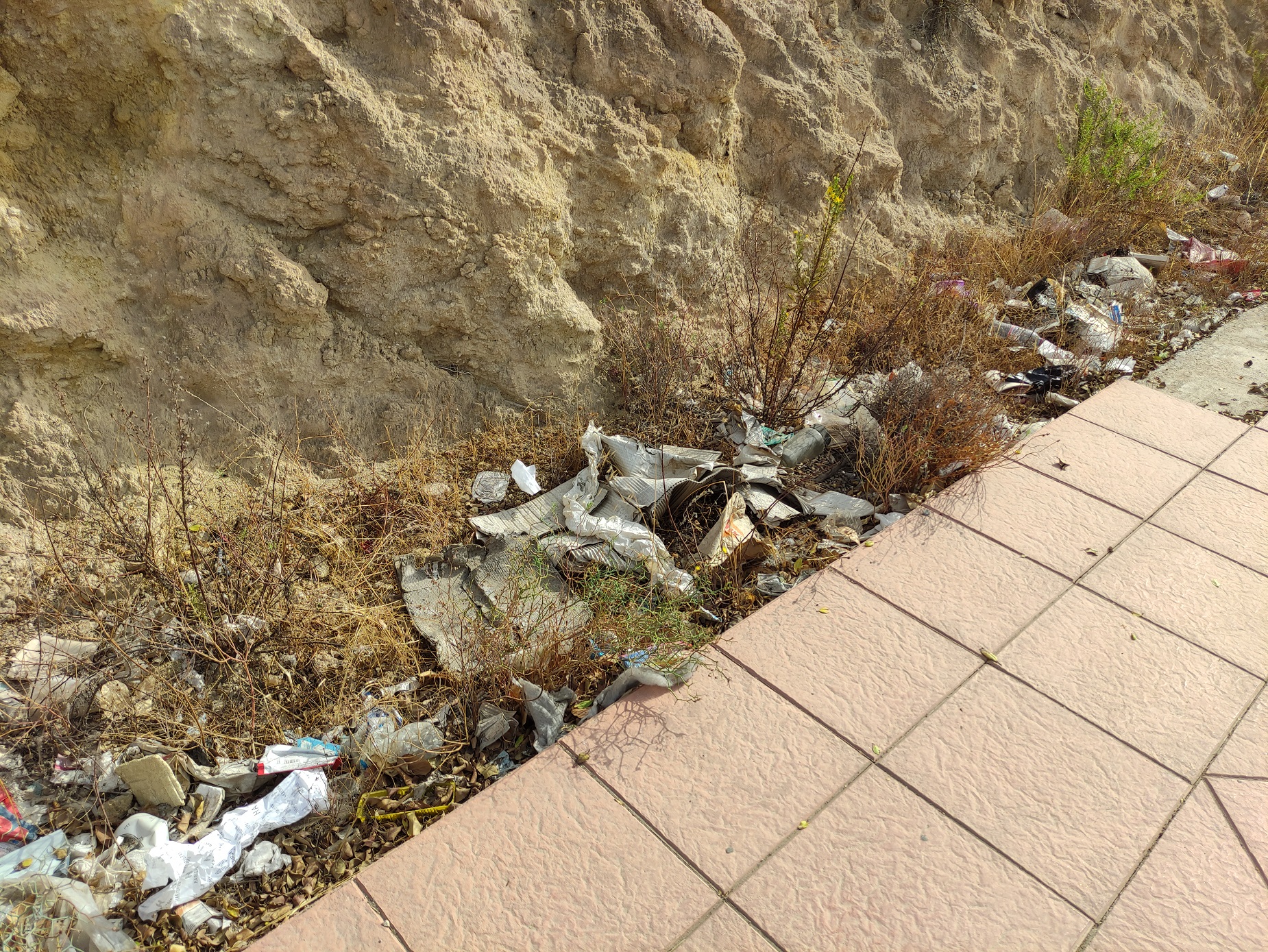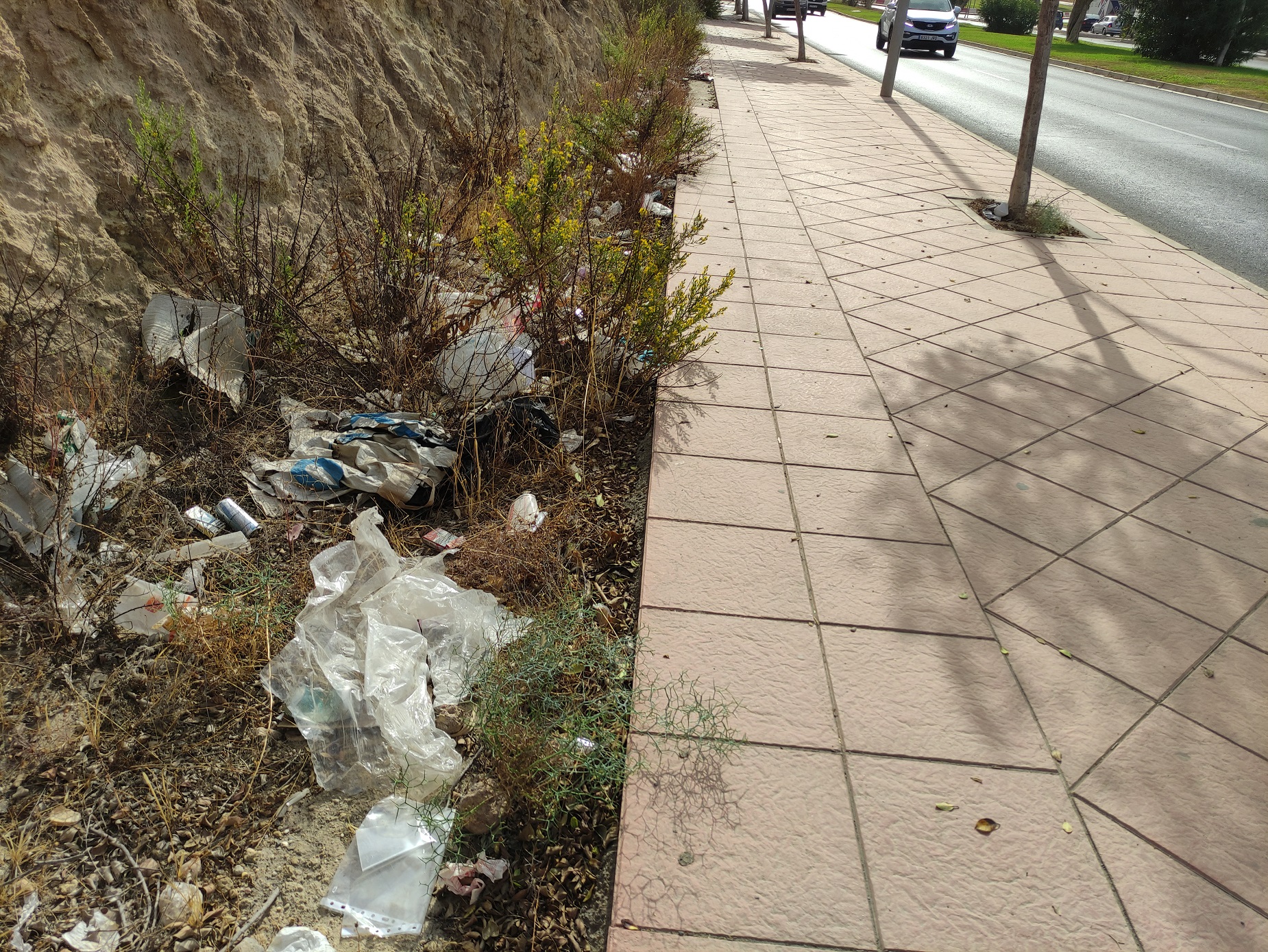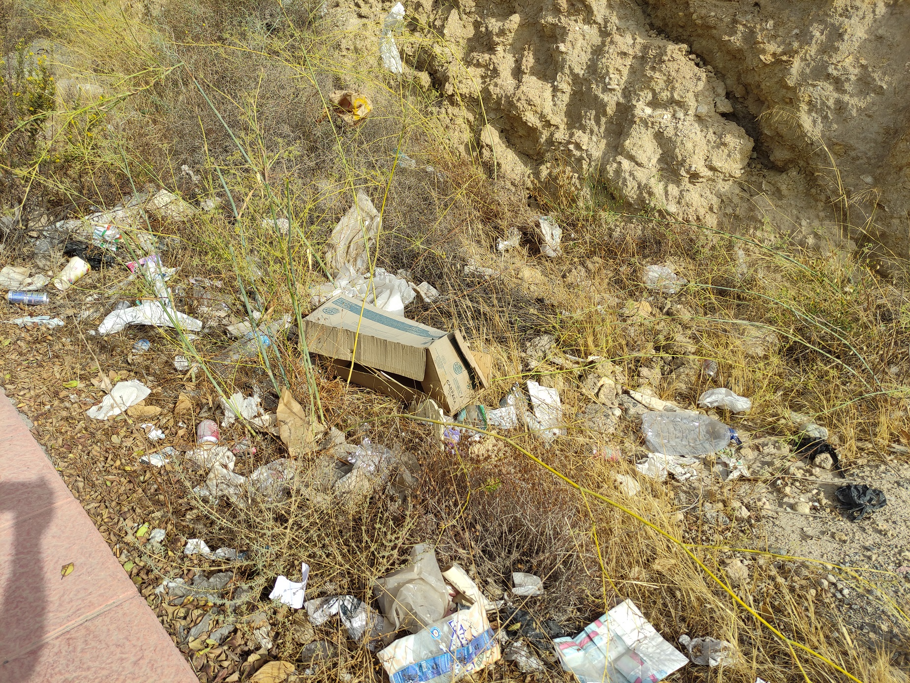 Un simple paseo, andando o en vehículo, por la avenida Torrecárdenas o la calle Hermanos Siret, hacen esquina, lindando con los aparcamientos y con algunos edificios del complejo hospitalario y diversos pisos que ya están habitados, nos da una idea de la dimensión de la suciedad almacenada entre maleza, sin control alguno, en la ladera del mismo cerro. Hay basura de cualquier tipo que pueda uno imaginarse, ya acumulada de hace tiempo, sobre todo objetos de plástico; residuos, prendas de vestir -hasta ropa interior-, edredones, colchonetas, mascarillas, vallas abandonadas, envases de cartón, etc. ¡Tremendo!