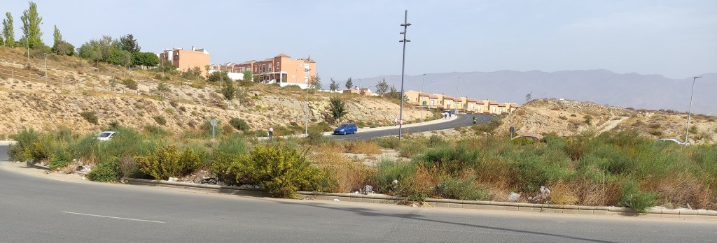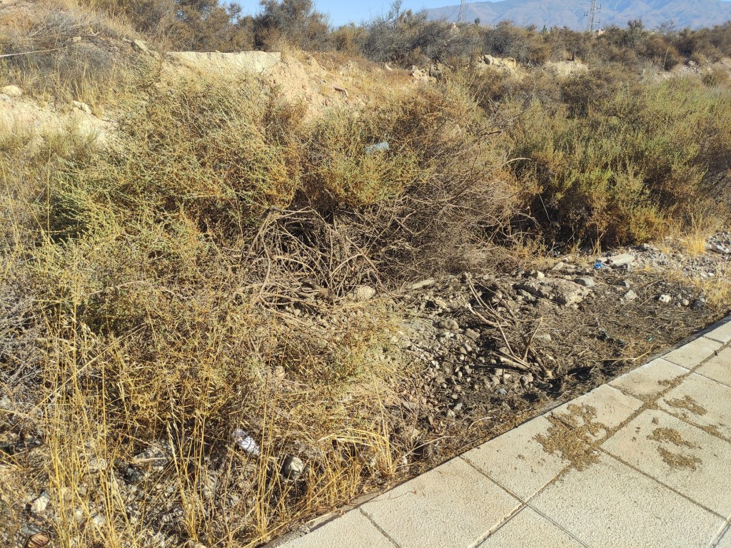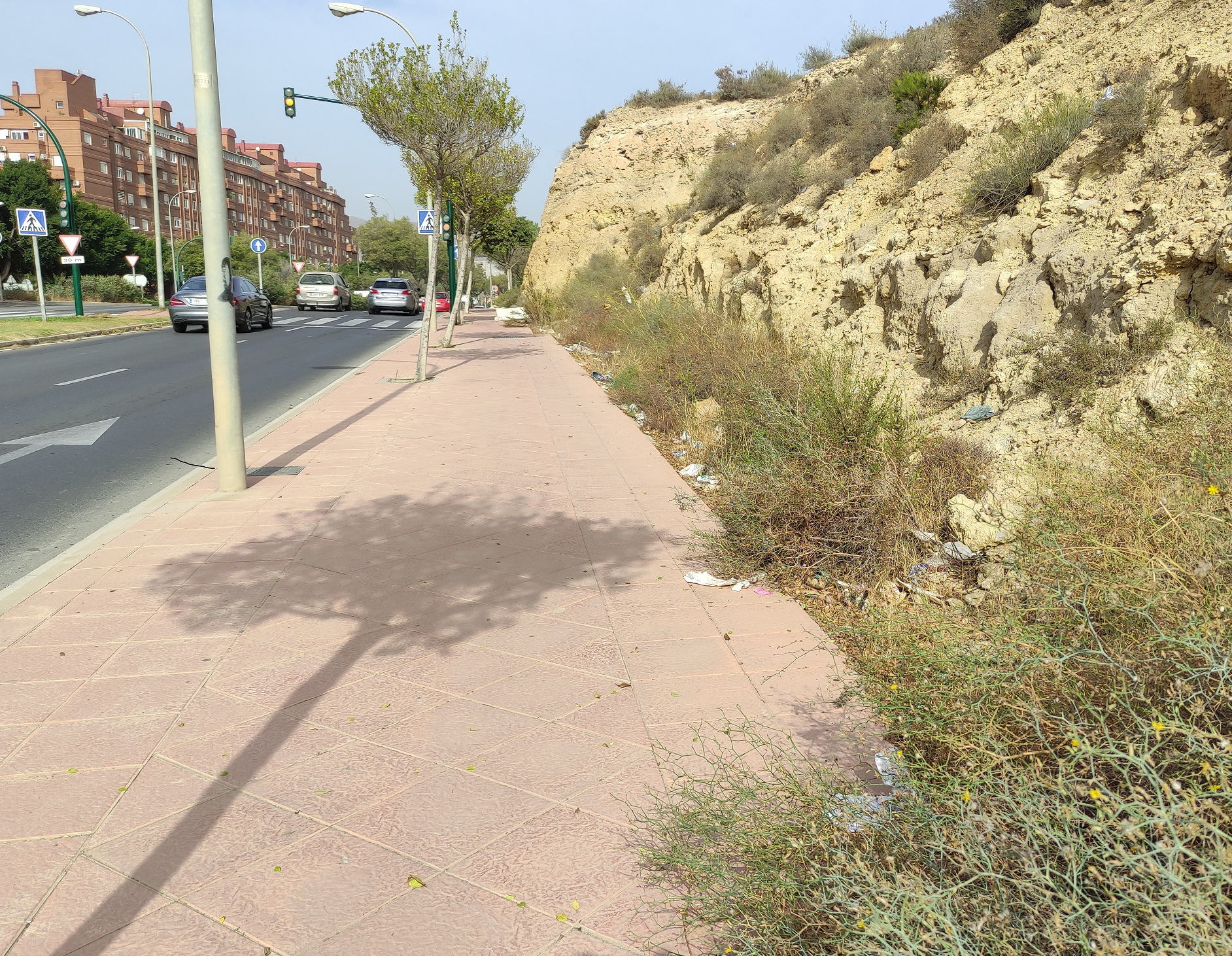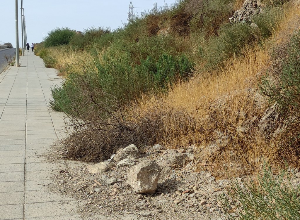 Ese día, 30 de septiembre, en la misma red social de Facebook, decíamos: «Matorrales arrancados y amontonados junto a basura, camino del Hospital Torrecárdenas. Entre el Centro Comercial Torrecárdenas y el Hospital -en paralelo a la calle Médico Francisco Pérez Company-, y en esta dirección, partiendo de la parada del autobús, asciende un camino bien asfaltado y acerado, en cuesta, que usan peatones, vehículos, y ahora parece que el transporte lanzadera entre el aparcamiento del centro comercial y el complejo sanitario. Ahí estaban trabajando, el 27 de septiembre, personal de ‘Almería Limpia’ con maquinaria. Arrancaban los matorrales y los arrinconaban junto al monte, al mismo borde de la acera, dejando la basura y los residuos también. Esperemos retiren una cosa y la otra, a no tardar mucho, si no lo han hecho ya, porque el aspecto es tercermundista. Así estaba la zona -ver imágenes-, coronada por una rotonda secarral, más próxima al hospital, donde confluyen las calles José Jiménez Lozano y Hermanos Siret, el 28 de septiembre de 2022, a las 10:30 h. Los comentarios son para todos los gustos«. La situación no solo sigue igual, sino que, lógicamente, ha empeorado. La única acera que tiene está siendo, por tramos, invadida por matojos y abundantes saltamontes que hay que ir salvando y abriéndose paso entre ellos. Un despropósito.