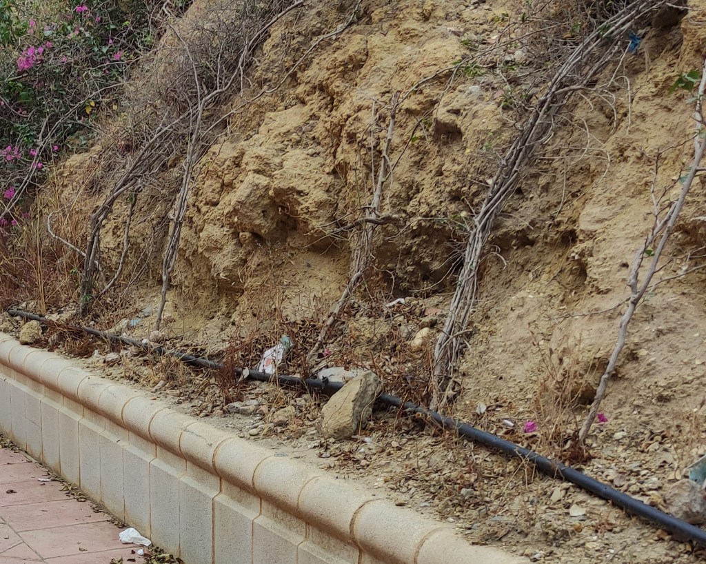 Lo de la calle Hermanos Siret se agrava porque a unos metros, solo cruzar la calzada, hay una serie de viviendas habitadas por numerosas familias que aparcan allí mismo sus coches. Al parecer, en la ladera del cerro del complejo hospitalario instalaron en su día una zona ajardinada, pero el abandono ha dado lugar a que las plantaciones se sequen, algunas malvivan, y el sistema de riego esté destrozado y al descubierto. Si a eso le sumamos las basuras acumuladas, la situación es explosiva.