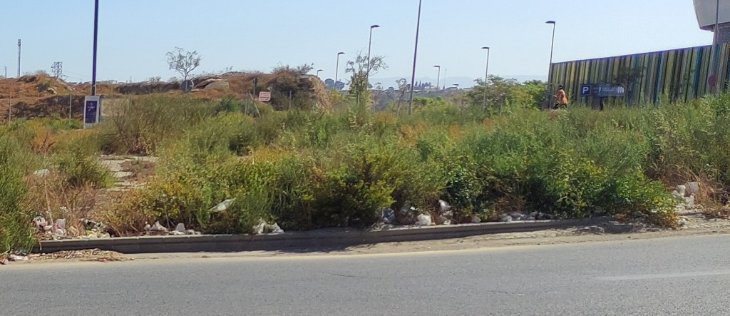 Si accedemos al complejo hospitalario desde la rotonda del Centro Comercial Torrecárdenas -otro basurero público-, junto a la parada del autobús, por la cuesta paralela a la calle Médico Francisco Pérez Company, la situación es similar, aunque los matorrales abundan más, muchos arrancados y apilados allí mismo. Hay insectos muy variados y hasta una auténtica plaga de saltamontes entre los que hay que abrirse paso. Esa vía, en cuesta, está últimamente más transitada, ya que algunos profesionales sanitarios o visitantes a los hospitales o consultas utilizan el parking del centro comercial.