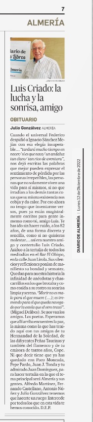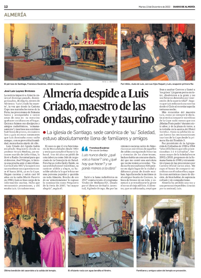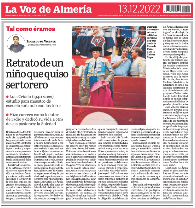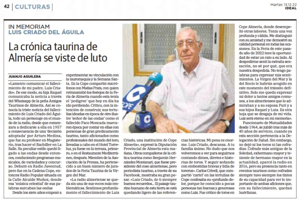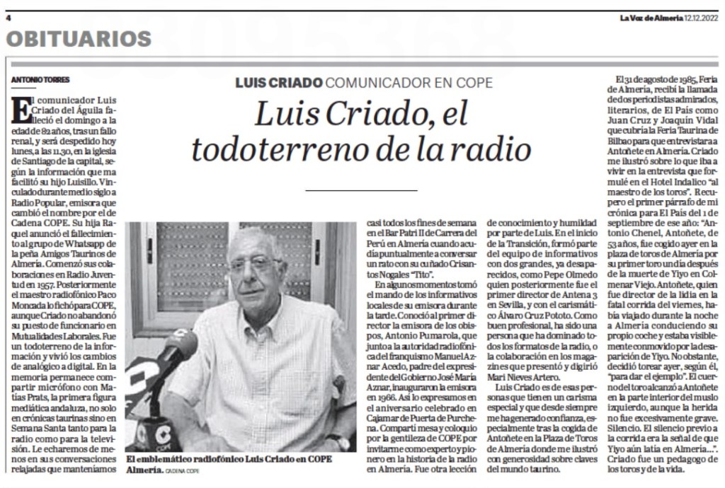 Este 11 de diciembre de 2022 ha fallecido Luis Criado del Águila (1940-2022), la voz entrañable y cercana de la radio almeriense, un todoterreno de las ondas, que nunca quiso traspasar la línea de colaborador de los medios radiofónicos. Decimos adiós a una persona intachable, todo bondad y servicio, un almeriense de pro, que deja una profunda huella y ejemplar trayectoria en el mundo de los medios de comunicación, de la función pública, de la tauromaquia y de la Iglesia. Comprometido, riguroso, fiel a sus principios y valores, supo granjearse la amistad de cuantos le conocieron.
