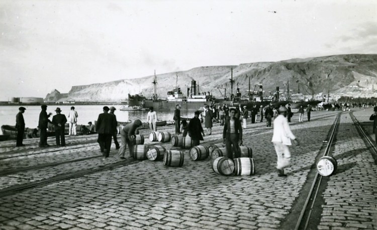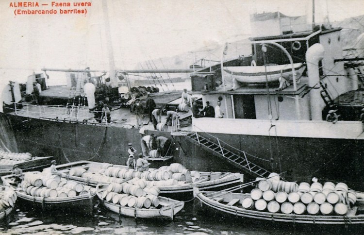 Por levante y por poniente entraban en el puerto largas caravanas de estos carros de largas reatas con su preciada mercancía que, con maestría sin igual eran apilados bajo los tinglados del muelle, a veces con abundancia tal que incluso las viseras de éstos eran insuficientes para protegerlos y llegaban a desbordarse hasta el mismo malecón, en el paso de los peatones. Era una estampa maravillosa de gran colorido aquella actividad de todo el puerto, aquel trasiego continuo de los barriles en su descarga, en su acomodo bajo los tinglados o en su transporte a través de aquellos carriles inclinados que los llevaban hasta el filo del cantil para acoplarlos en las grandes barcazas que los trasladarían hasta la bodega del barco. En diversas colecciones de tarjetas postales de aquella época el tema del embarque de la uva se nos muestra en toda su grandeza. Tengo a la vista varias de ellas entre las que selecciono dos de ellas: una por la abundancia de barriles sobre el puerto dispuestos para la carga y la otra como testimonio del tremendo movimiento del embarque. Todavía en otra, el objetivo fotográfico alcanza a situar cinco barcos en primer término en plena faena de carga, mientras al fondo, en el dique de poniente, se alinean seis barcos más en espera de su turno para poder hacerlo.