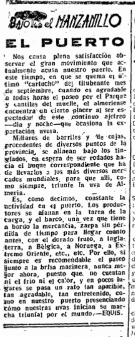 Nos causa plena satisfacción observar el gran movimiento que actualmente acusa nuestro puerto. En este tiempo, en que se quema el último «cartucho» del titubeante mes de septiembre, cuando es agradable a todas horas el paseo por el Parque y cantiles del muelle, el almeriense encuentra un cierto placer al ser espectador de este comienzo de ajetreo -día y noche-, que ocasiona la exportación uvera.