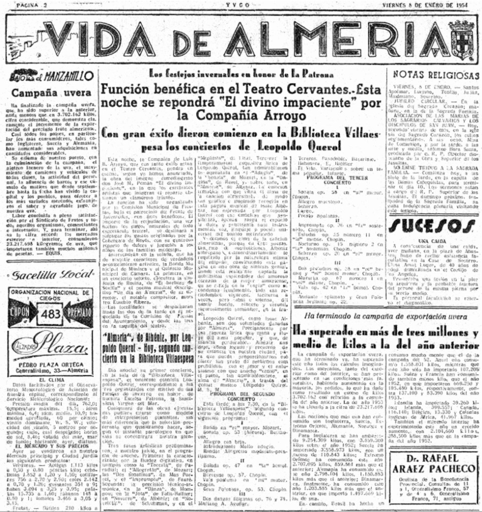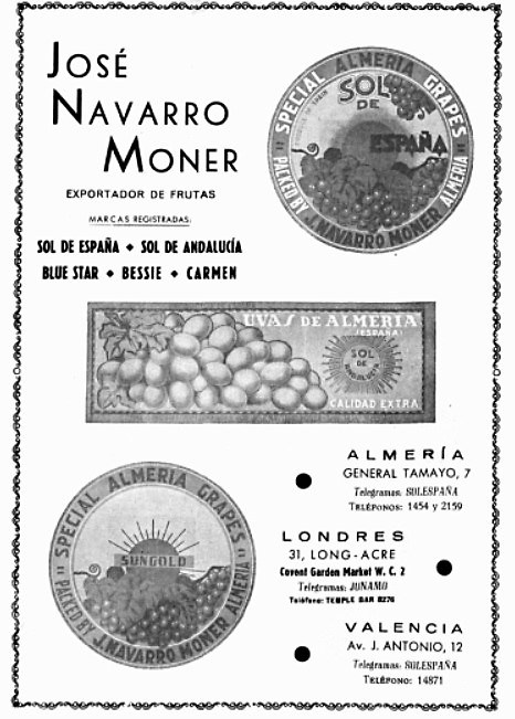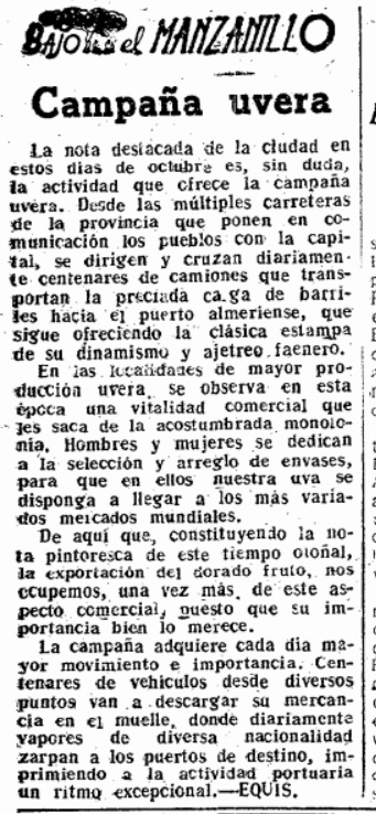Ha comenzado la campaña uvera. Los pueblos productores de la provincia recobran en sus campos el ajetreo y actividad propias de la época. El dorado fruto comienza a ser extraído de los parrales, en castizas y vistosas faenas para, debidamente acondicionado, ser exportado a los diversos mercados del mundo. Otra vez la uva de Almería recomienza su triunfo en los países consumidores.