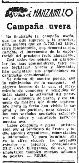 Labor concluida con plena satisfacción por el Sindicato de Frutos y todos aquellos organismos, comerciantes e interesados. Y, para terminar, ahí va la cifra récord: los mercados exterior e interior, consumieron 23.217.698 kilogramos de uva, que importaron también muchos millones de pesetas.