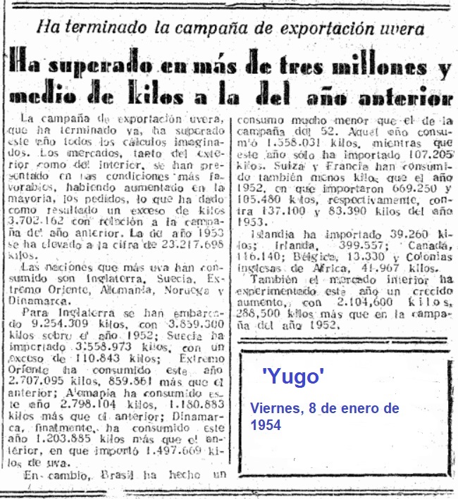 HA TERMINADO LA CAMPAÑA DE EXPORTACIÓN UVERA: HA SUPERADO EN MÁS DE TRES MILLONES Y MEDIO DE KILOS A LA DEL AÑO ANTERIOR.- La campaña de exportación uvera, que ha terminado ya, ha superado este año todos los cálculos imaginados. Los mercados, tanto del exterior como del interior, se han presentado en las condiciones más favorables, habiendo aumentado en la mayoría, los pedidos, lo que ha dado como resultado un exceso de kilos 3.702.162 con relación a la campaña del año anterior. La del año 1953 se ha elevado a la cifra de 23.217.698 kilos.