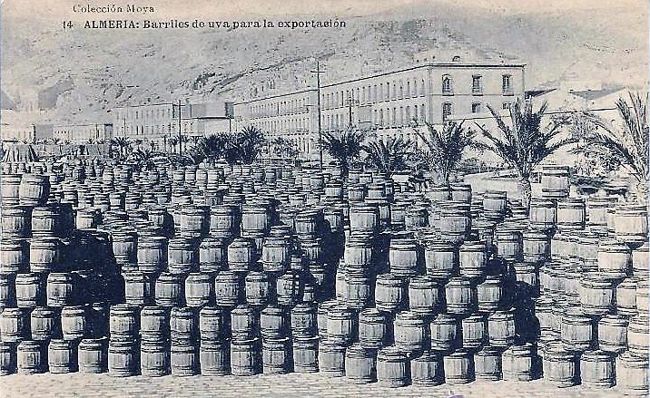 Millares de barriles y de cajas, procedentes de diversos puntos de la provincia, se alinean bajo los tinglados, en espera de ser rodados hacia el buque correspondiente que ha de llevarlos a los más diversos mercados mundiales, para que allí, como siempre, triunfe la uva de Almería.