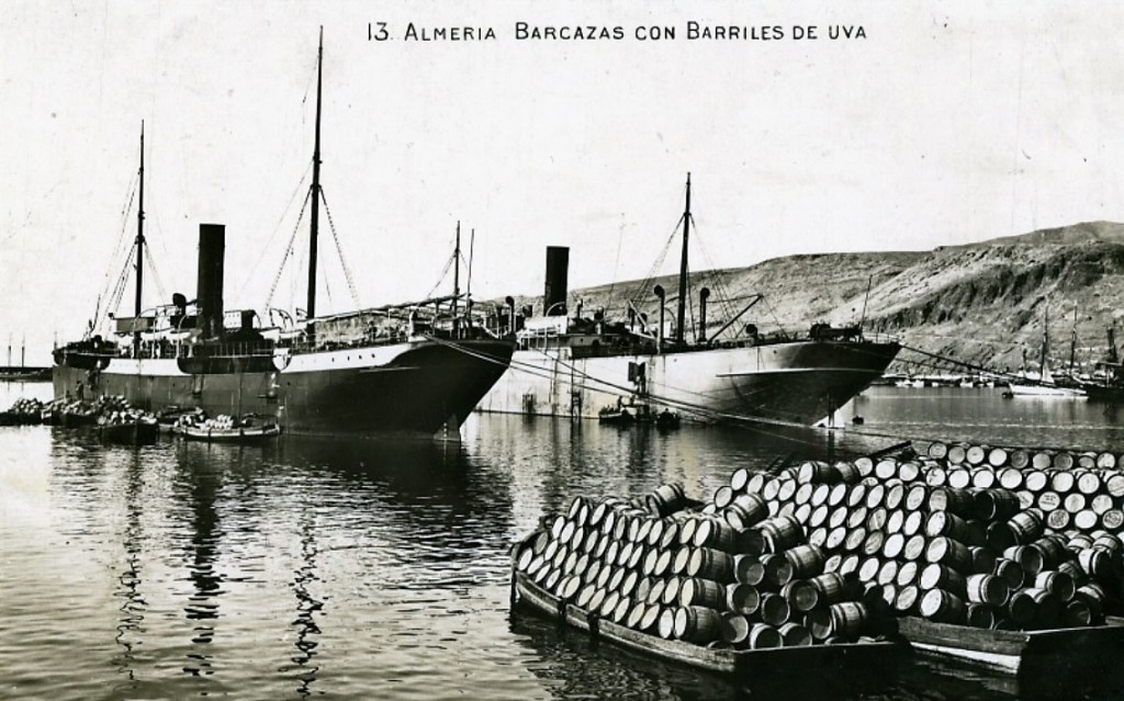 NOTA.- La imagen destacada de portada refleja la gran actividad del Puerto de Almería en los años 50 del pasado siglo. Barcazas con barriles de uva, perfectamente ordenados, aguardan para las operaciones de carga, que llevarán a depositar el preciado fruto en las bodegas de los barcos atracados en en el puerto.- Foto BIBLIOTECA DIGITAL DE LA DIPUTACIÓN DE ALMERÍA.