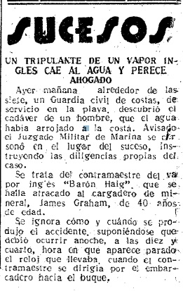 SUCESO: UN TRIPULANTE DE UN VAPOR INGLÉS CAE AL AGUA Y PERECE AHOGADO.- Ayer mañana (7 de octubre de 1953) alrededor de las siete, un guardia civil de costas, de servicio en la playa, descubrió el cadáver de un hombre, que el agua había arrojado a la costa. Avisado el Juzgado Militar de Marina se personó en el lugar del suceso, instruyendo las diligencias propias del caso. Se trata del contramaestre del vapor inglés «Barón Haig«, que se halla atracado al cargadero de mineral, James Graham, de 40 años de edad. Se ignora cómo y cuándo se produjo el accidente, suponiéndose que debió ocurrir anoche, a las diez y cuarto, hora en que aparece parado el reloj que llevaba, cuando el contramaestre se dirigía por el embarcadero hacia el buque. (‘Yugo‘, 8 de octubre de 1953)