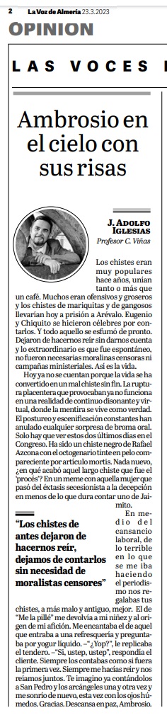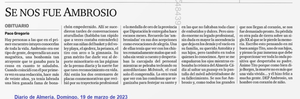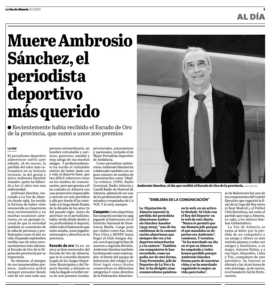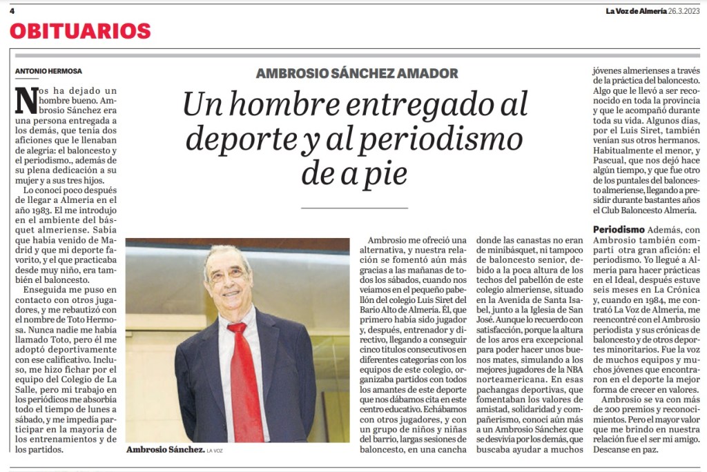 Ambrosio apareció por la redacción de ‘La Voz de Almería‘, a mediados de los años setenta, para colaborar, «en lo que fuese necesario», en temas de baloncesto. Puntualmente llevaba los datos para elaborar la crónica baloncestística de cualquier partido o club, sin tener que ser el suyo, ni siquiera su categoría. Fue un fiel colaborador hasta que, poco a poco, fue aprendiendo la técnica de la redacción y concluiría, de forma autodidacta y guiados por quienes regíamos la redacción de deportes de ‘La Voz‘, a elaborar y producir sus propias crónicas, que a principios de los años 80 comenzamos a firmarle como ‘As‘ (Ambrosio Sánchez).